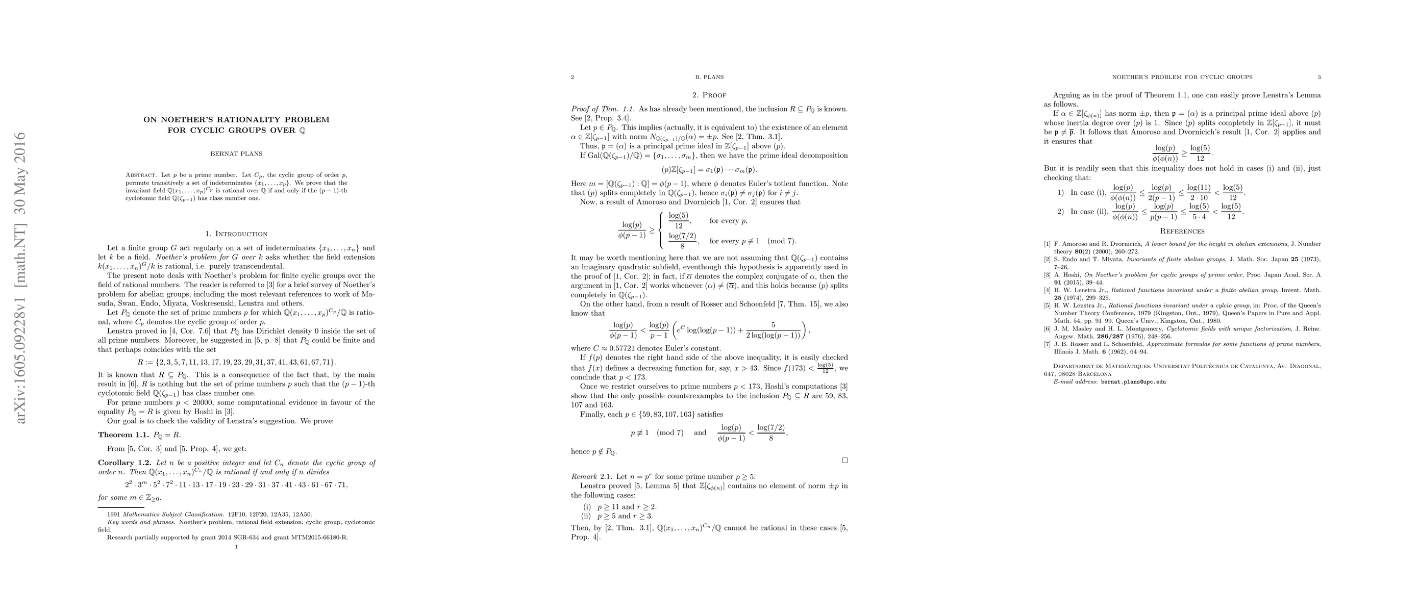 The paper investigates whether the invariant field of a cyclic group over Q is rational if and only if the (p-1)-th cyclotomic field has class number one.