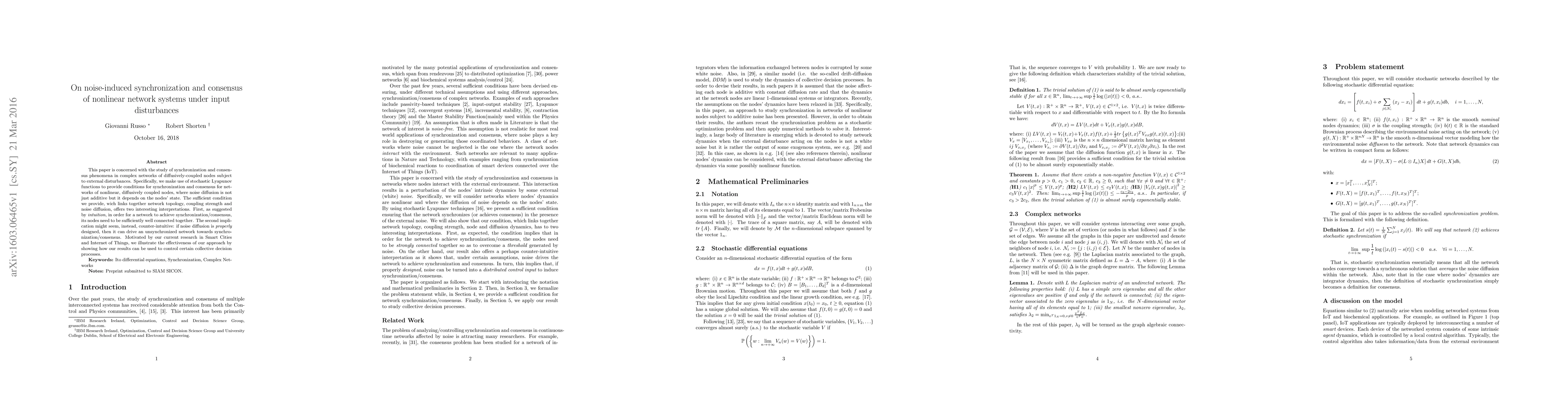 This paper is concerned with the study of synchronization and consensus phenomena in complex networks of diffusively-coupled nodes subject to external disturbances. Specifically, we make use of stochastic Lyapunov functions to provide conditions for synchronization and consensus for networks of nonlinear, diffusively coupled nodes, where noise diffusion is not just additive but it depends on the nodes' state. The sufficient condition we provide, wich links together network topology, coupling strength and noise diffusion, offers two interesting interpretations. First, as suggested by {\em intuition}, in order for a network to achieve synchronization/consensus, its nodes need to be sufficiently well connected together. The second implication might seem, instead, counter-intuitive: if noise diffusion is {\em properly} designed, then it can drive an unsynchronized network towards synchronization/consensus. Motivated by our current research in Smart Cities and Internet of Things, we illustrate the effectiveness of our approach by showing how our results can be used to control certain collective decision processes.