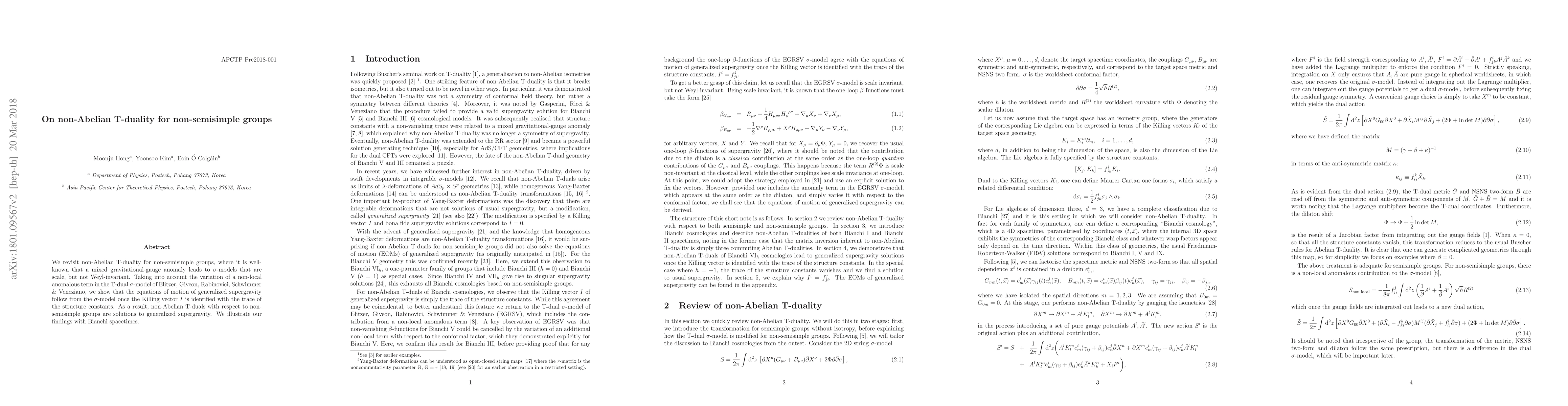 This paper explores non-Abelian T-duality for non-semisimple groups, demonstrating that the equations of motion for generalized supergravity can be derived from the T-dual $\sigma$-model by identifying the Killing vector with the trace of the structure constants, thus showing that such T-duals solve generalized supergravity. The findings are exemplified using Bianchi spacetimes.