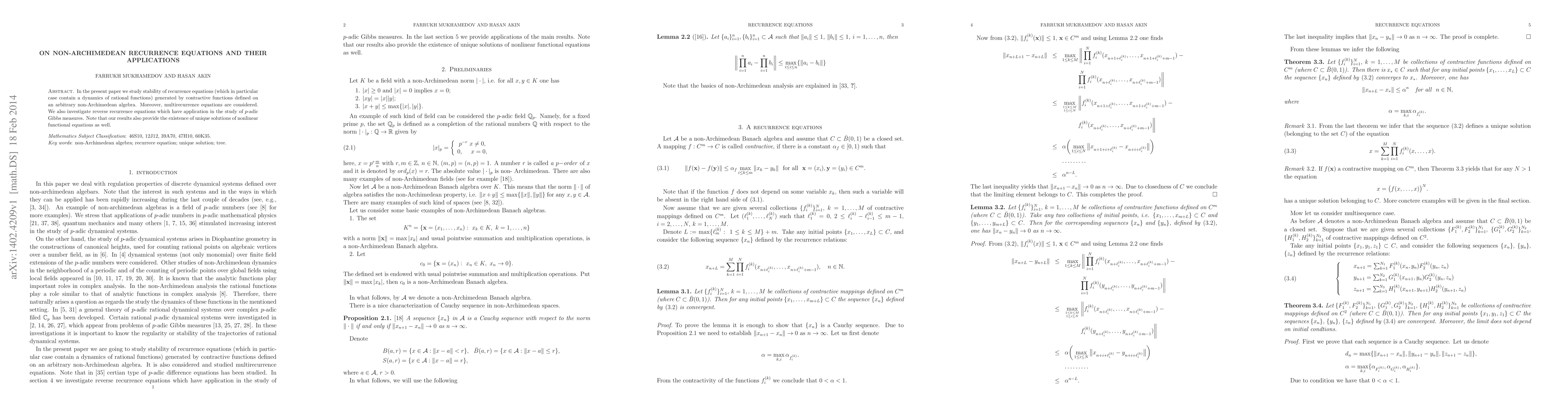 This paper explores the stability of recurrence equations, including dynamics of rational functions, generated by contractive functions in non-Archimedean algebras. It also examines multirecurrence and reverse recurrence equations, with applications to $p$-adic Gibbs measures, and establishes the existence of unique solutions for nonlinear functional equations.