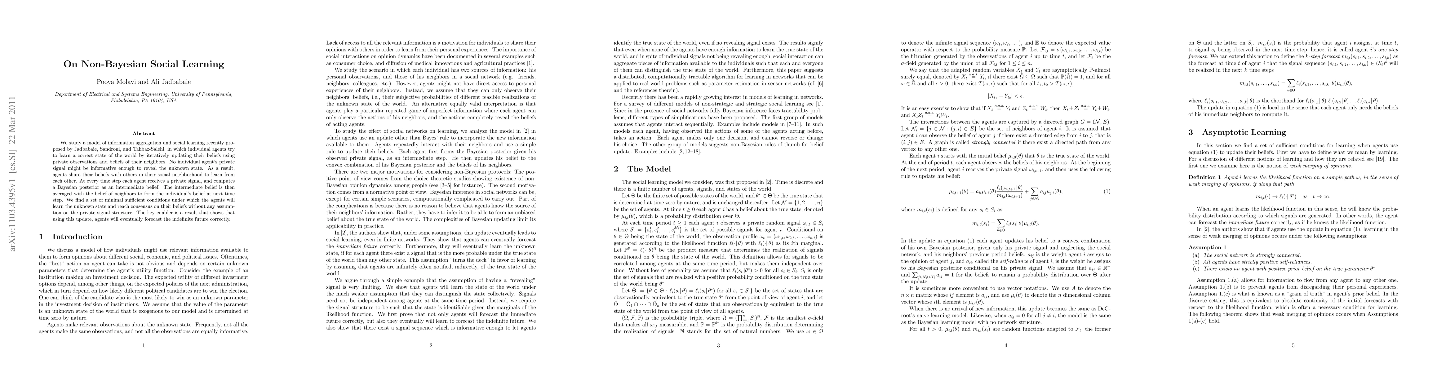 The paper studies a model of information aggregation and social learning where agents iteratively update their beliefs using private observations and neighbors' beliefs, without assuming informative private signals.