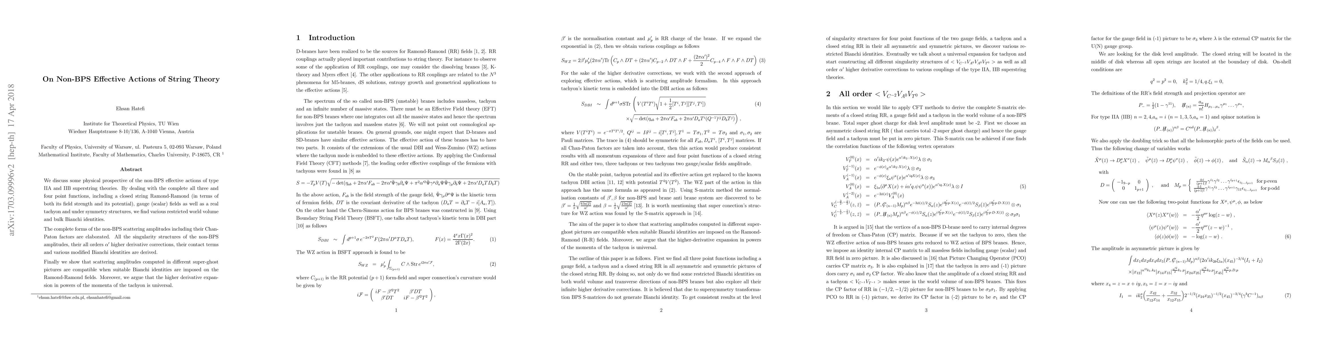 We discuss some physical prospective of the non-BPS effective actions of type IIA and IIB superstring theories. By dealing with the complete all three and four point functions, including a closed string Ramond-Ramond (in terms of both its field strength and its potential), gauge (scalar) fields as well as a real tachyon and under symmetry structures, we find various restricted world volume and bulk Bianchi identities. The complete forms of the non-BPS scattering amplitudes including their Chan-Paton factors are elaborated. All the singularity structures of the non-BPS amplitudes, their all orders $\alpha'$ higher derivative corrections, their contact terms and various modified Bianchi identities are derived. Finally we show that scattering amplitudes computed in different super-ghost pictures are compatible when suitable Bianchi identities are imposed on the Ramond-Ramond fields. Moreover, we argue that the higher derivative expansion in powers of the momenta of the tachyon is universal.