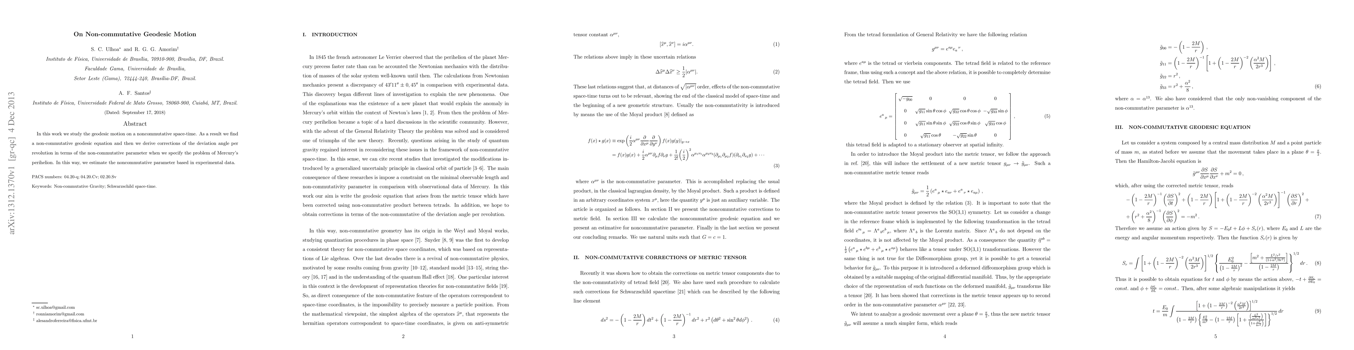 This paper investigates geodesic motion on non-commutative space-time, deriving a non-commutative geodesic equation and calculating corrections to the deviation angle per revolution in terms of the non-commutative parameter, ultimately estimating this parameter using Mercury's perihelion data.