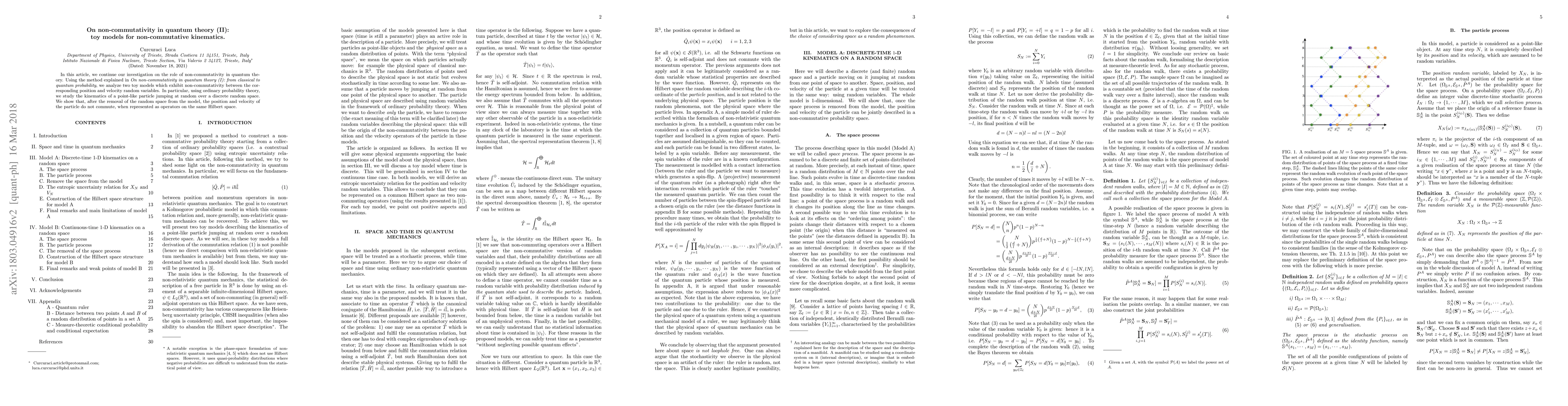 This paper explores non-commutativity in quantum theory through two toy models of a particle jumping randomly over a discrete space. It demonstrates that position and velocity operators do not commute, even after removing the random space, highlighting the fundamental role of non-commutativity in quantum kinematics.