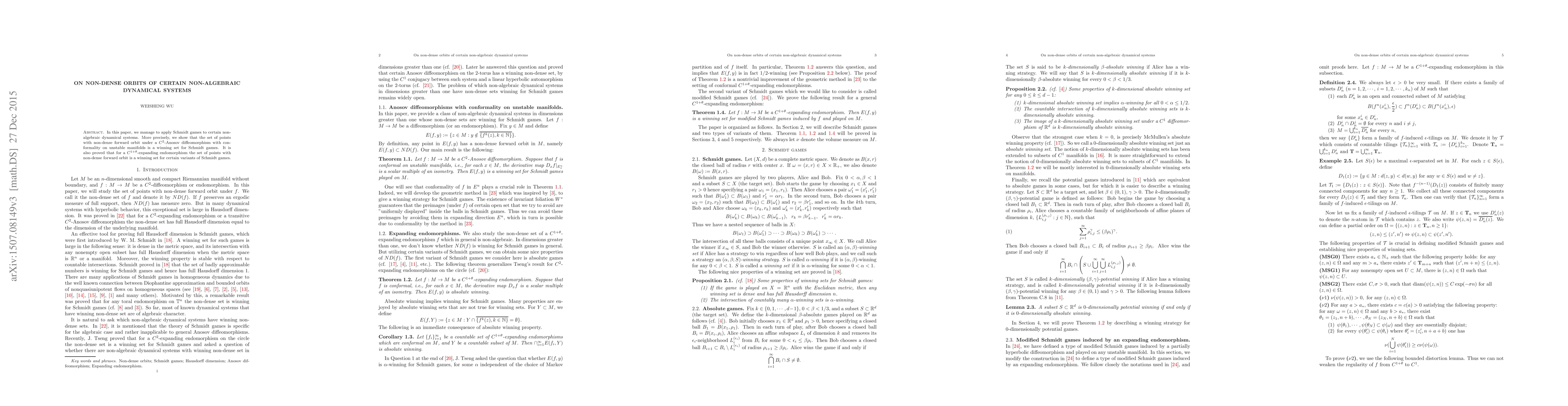 This paper applies Schmidt games to non-algebraic dynamical systems, demonstrating that points with non-dense orbits under specific $C^2$-Anosov diffeomorphisms form winning sets in these games. It further proves similar results for $C^{1+\theta}$-expanding endomorphisms.