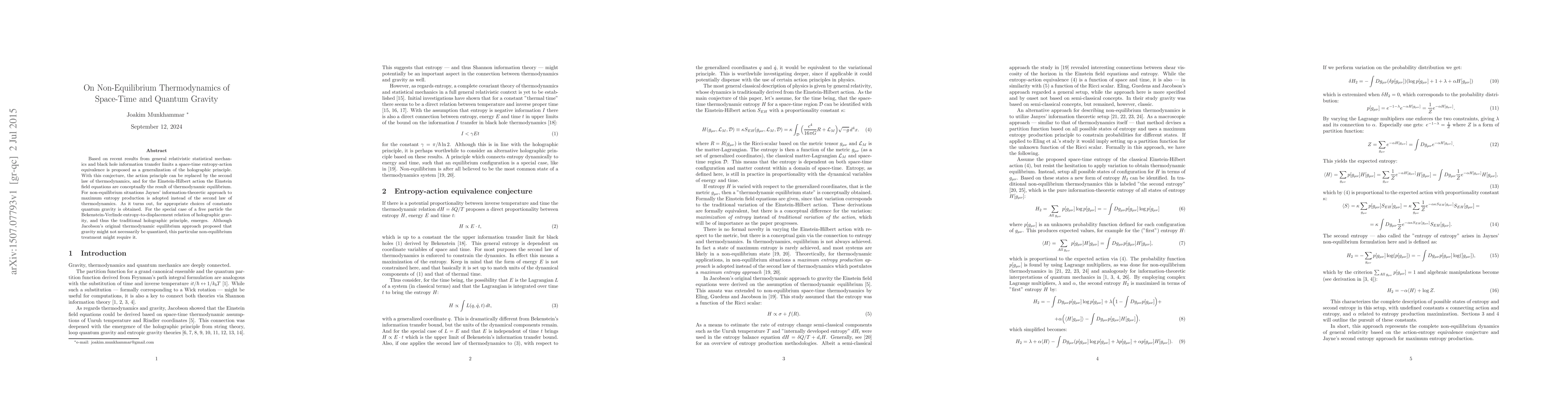 This paper proposes a space-time entropy-action equivalence based on general relativistic statistical mechanics, suggesting that Einstein field equations arise from thermodynamic equilibrium. For non-equilibrium scenarios, it adopts Jaynes' maximum entropy production principle, potentially leading to quantum gravity.