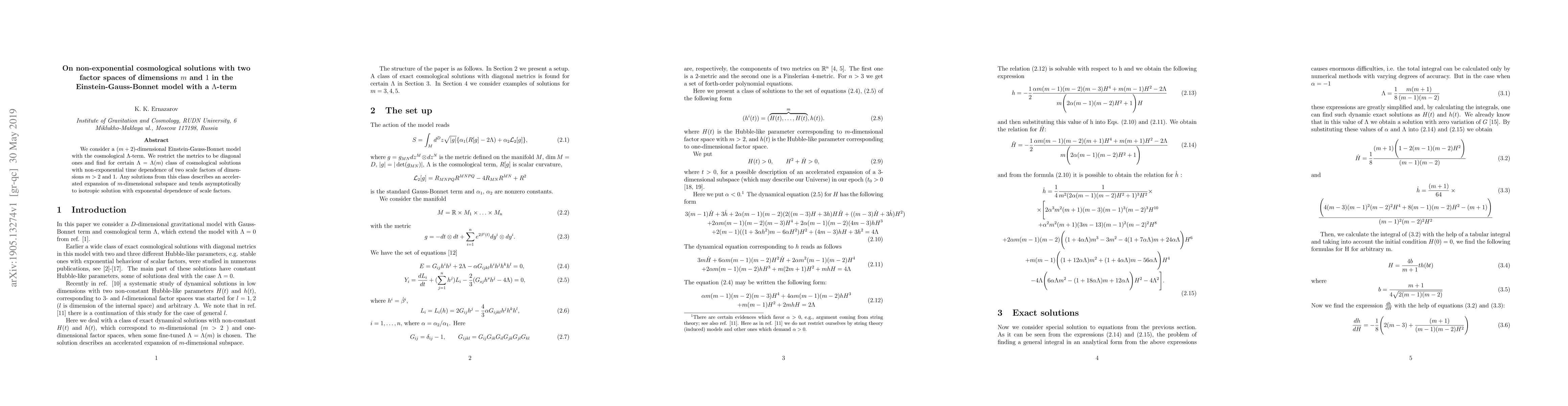 We consider a $(m+2)$-dimensional Einstein-Gauss-Bonnet model with the cosmological $\Lambda$-term. We restrict the metrics to be diagonal ones and find for certain $\Lambda = \Lambda(m)$ class of cosmological solutions with non-exponential time dependence of two scale factors of dimensions $m > 2$ and $1$. Any solutions from this class describes an accelerated expansion of $m$-dimensional subspace and tends asymptotically to isotropic solution with exponental dependence of scale factors.