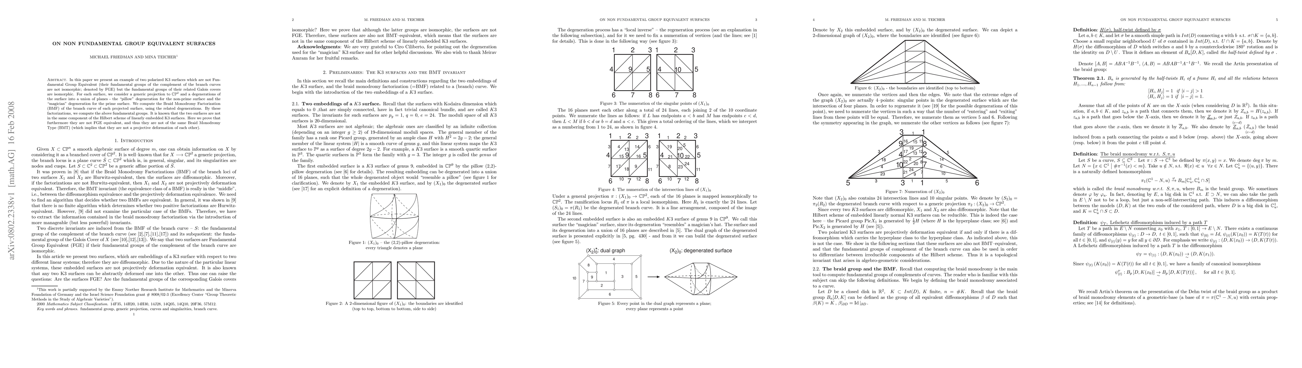 This paper identifies two polarized K3 surfaces that are not Fundamental Group Equivalent, despite having isomorphic fundamental groups in their related Galois covers. It demonstrates this by computing the Braid Monodromy Factorization of the branch curves derived from their projections and degenerations, proving they are not of the same Braid Monodromy Type.