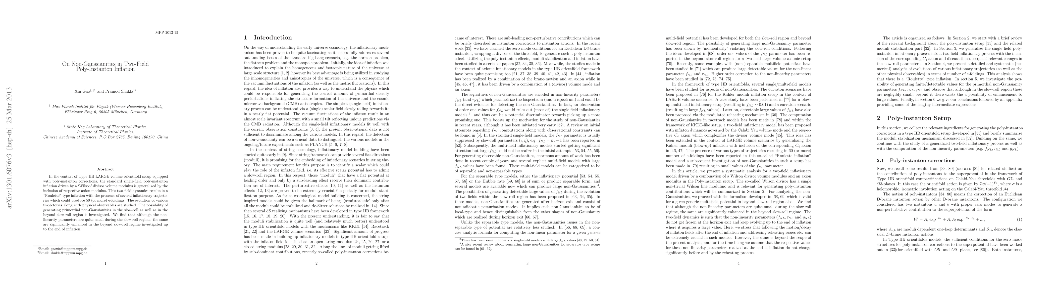 This paper explores a two-field poly-instanton inflation model in a Type IIB LARGE volume orientifold setup, introducing axion moduli to the standard single-field model. The study investigates non-Gaussianities in the resulting "Roulette" type inflation, revealing significant enhancements in non-linearity parameters beyond the slow-roll regime.