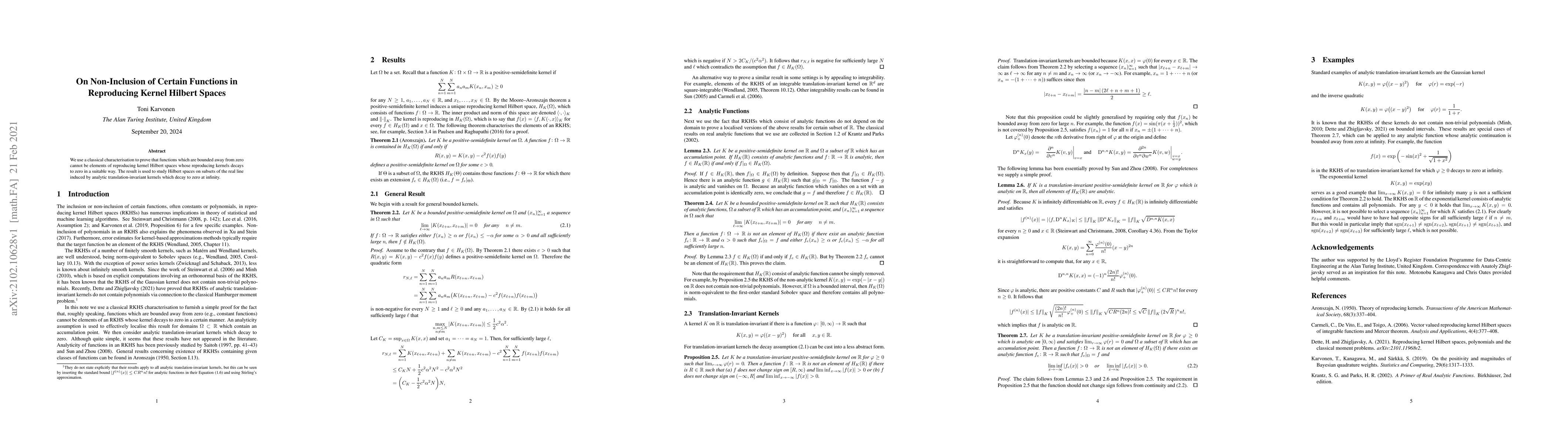 Summary: The paper demonstrates that functions bounded away from zero do not belong to reproducing kernel Hilbert spaces with kernels that decay to zero, and applies this result to analyze Hilbert spaces on subsets of the real line with analytic translation-invariant kernels that vanish at infinity.