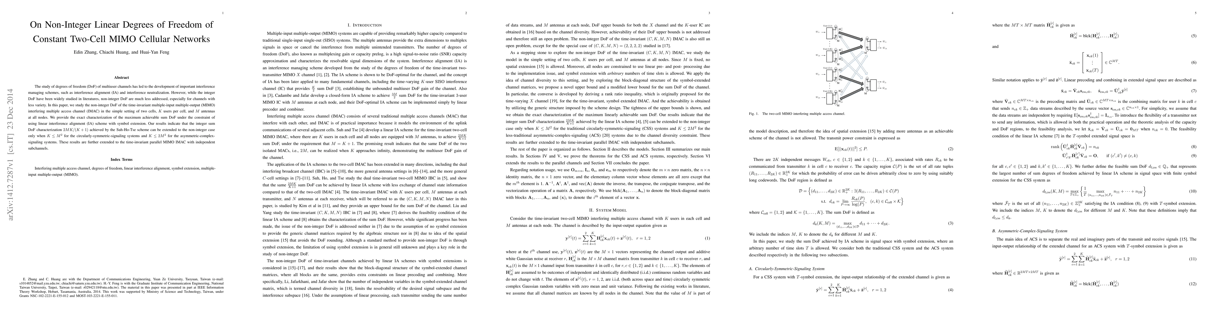 This paper examines non-integer degrees of freedom in two-cell MIMO interfering multiple access channels, extending the integer DoF characterization to non-integer cases under linear interference alignment. The extension is valid for K ≤ M^2 in circularly-symmetric-signaling systems and K ≤ 2M^2 for asymmetric-complex-signaling systems, with results applicable to time-invariant parallel MIMO IMAC with independent subchannels.