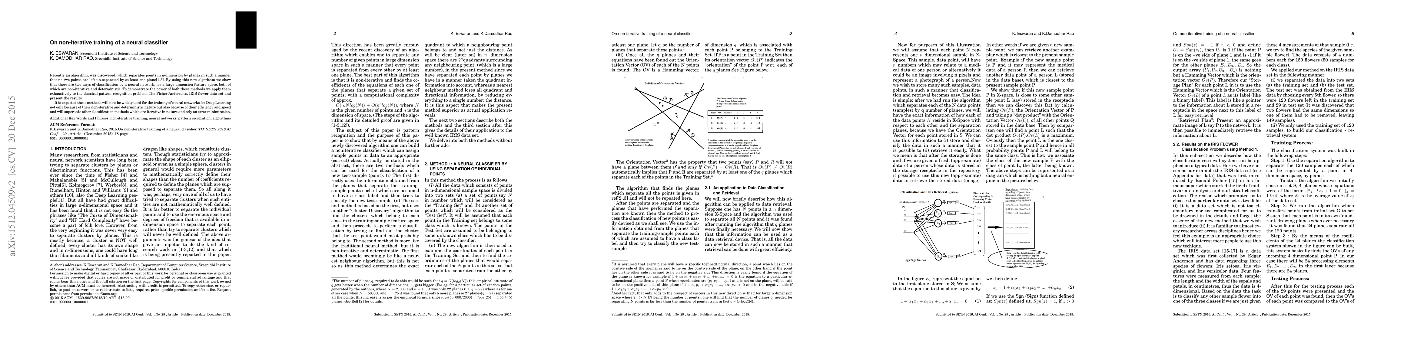 Recently an algorithm, was discovered, which separates points in n-dimension by planes in such a manner that no two points are left un-separated by at least one plane{[}1-3{]}. By using this new algorithm we show that there are two ways of classification by a neural network, for a large dimension feature space, both of which are non-iterative and deterministic. To demonstrate the power of both these methods we apply them exhaustively to the classical pattern recognition problem: The Fisher-Anderson's, IRIS flower data set and present the results. It is expected these methods will now be widely used for the training of neural networks for Deep Learning not only because of their non-iterative and deterministic nature but also because of their efficiency and speed and will supersede other classification methods which are iterative in nature and rely on error minimization.