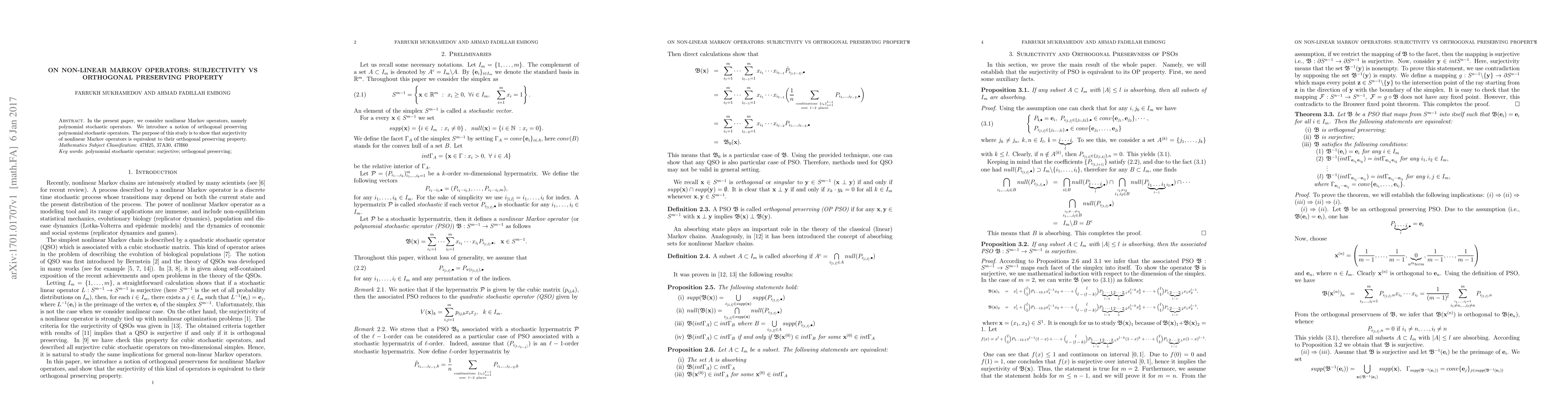 This paper investigates nonlinear Markov operators, specifically polynomial stochastic operators, and introduces the concept of orthogonal preserving operators. It demonstrates that surjectivity in these operators is equivalent to their orthogonal preserving property.