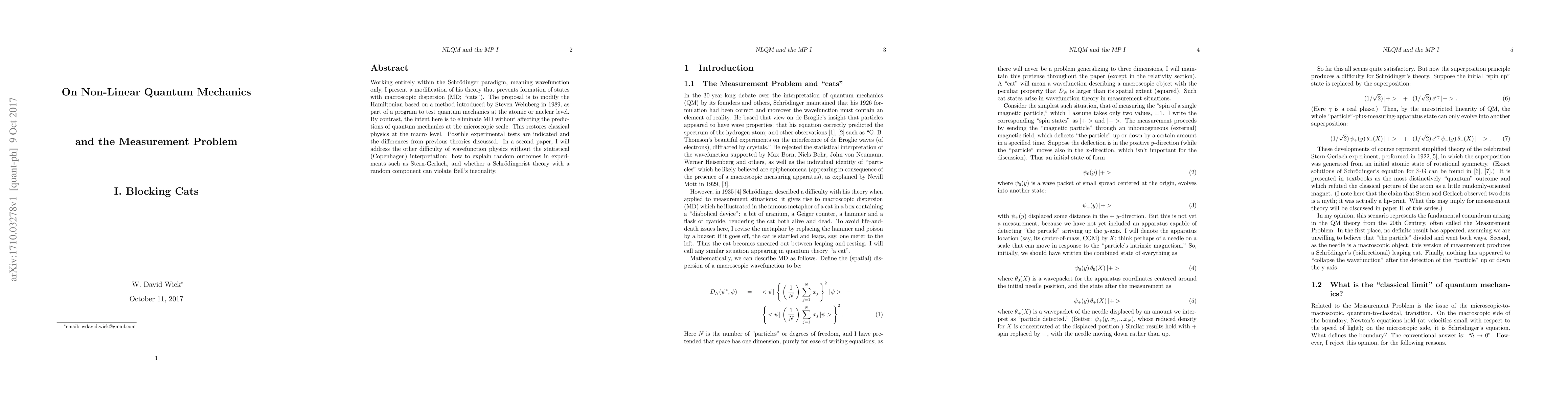 Working entirely within the Schroedinger paradigm, meaning wavefunction only, I present a modification of his theory that prevents formation of macroscopic dispersion (MD; "cats"). The proposal is to modify the Hamiltonian based on a method introduced by Steven Weinberg in 1989, as part of a program to test quantum mechanics at the atomic or nuclear level. By contrast, the intent here is to eliminate MD without affecting the predictions of quantum mechanics at the microscopic scale. This restores classical physics at the macro level. Possible experimental tests are indicated and the differences from previous theories discussed. In a second paper, I will address the other difficulty of wavefunction physics without the statistical (Copenhagen) interpretation: how to explain random outcomes in experiments such as Stern-Gerlach, and whether a Schroedingerist theory with a random component can violate Bell's inequality.