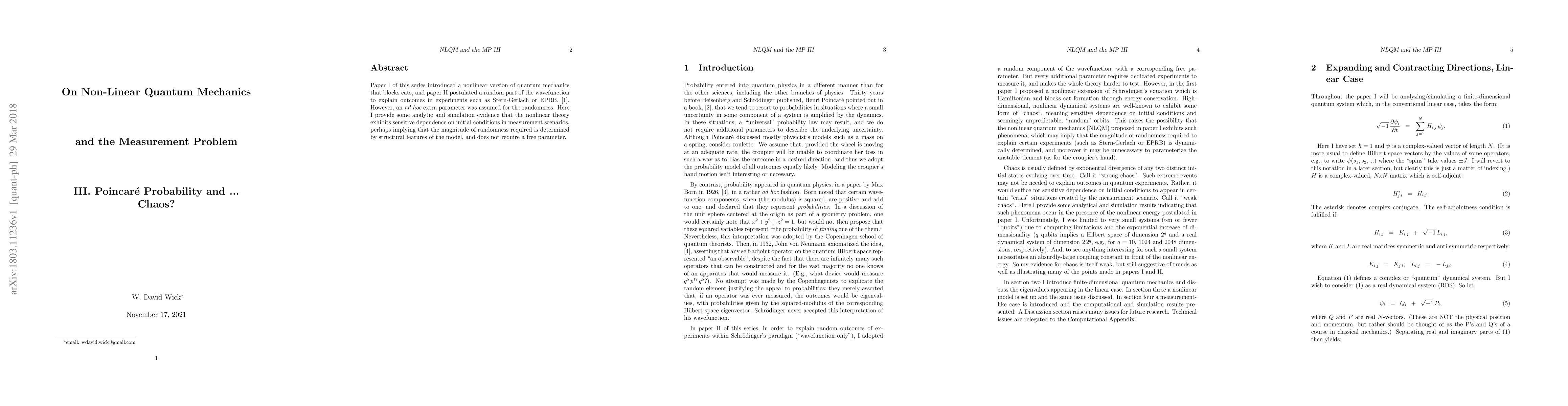 Paper I of this series introduced a nonlinear version of quantum mechanics that blocks cats, and paper II postulated a random part of the wavefunction to explain outcomes in experiments such as Stern-Gerlach or EPRB. However, an ad hoc extra parameter was assumed for the randomness. Here I provide some analytic and simulation evidence that the nonlinear theory exhibits sensitive dependence on initial conditions in measurement scenarios, perhaps implying that the magnitude of randomness required is determined by structural features of the model, and does not require a free parameter.