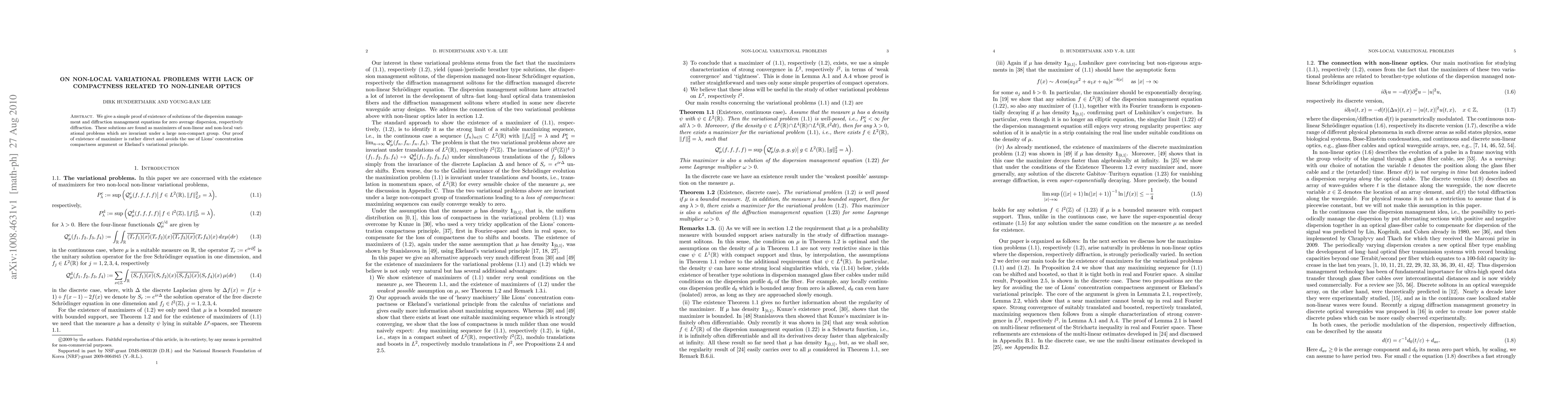 We give a simple proof of existence of solutions of the dispersion manage- ment and diffraction management equations for zero average dispersion, respectively diffraction. These solutions are found as maximizers of non-linear and non-local vari- ational problems which are invariant under a large non-compact group. Our proof of existence of maximizer is rather direct and avoids the use of Lions' concentration compactness argument or Ekeland's variational principle.