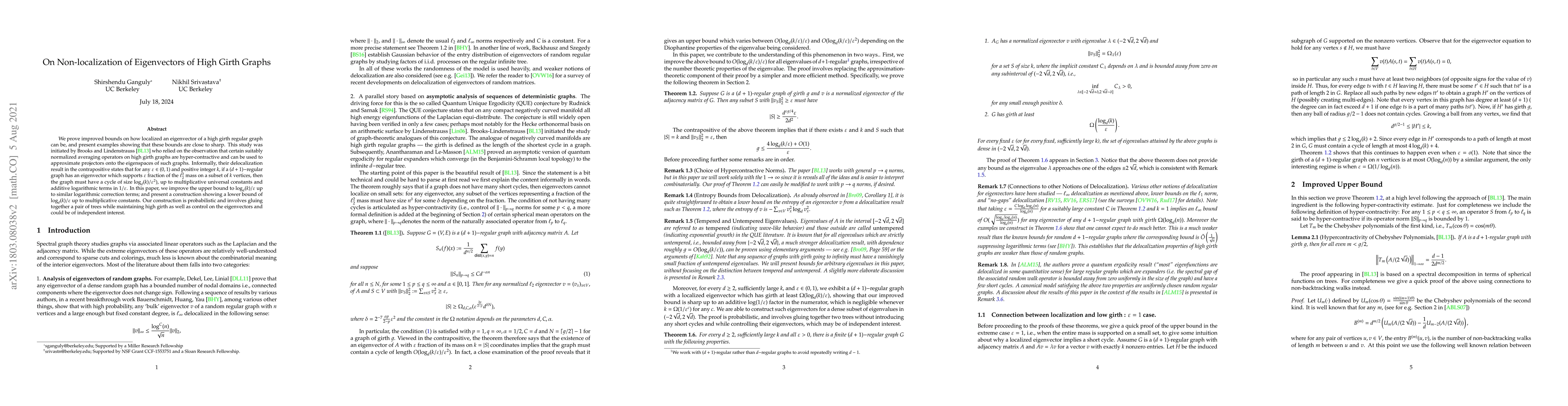 We prove improved bounds on how localized an eigenvector of a high girth regular graph can be, and present examples showing that these bounds are close to sharp. This study was initiated by Brooks and Lindenstrauss (2009) who relied on the observation that certain suitably normalized averaging operators on high girth graphs are hyper-contractive and can be used to approximate projectors onto the eigenspaces of such graphs. Informally, their delocalization result in the contrapositive states that for any $\varepsilon \in (0,1)$ and positive integer $k,$ if a $(d+1)-$regular graph has an eigenvector which supports $\varepsilon$ fraction of the $\ell_2^2$ mass on a subset of $k$ vertices, then the graph must have a cycle of size $\tilde{O}(\log_{d}(k)/\varepsilon^2)$, suppressing logarithmic terms in $1/\varepsilon$. In this paper, we improve the upper bound to $\tilde{O}(\log_{d}(k)/\varepsilon)$ and present a construction showing a lower bound of $\Omega(\log_d(k)/\varepsilon)$. Our construction is probabilistic and involves gluing together a pair of trees while maintaining high girth as well as control on the eigenvectors and could be of independent interest.