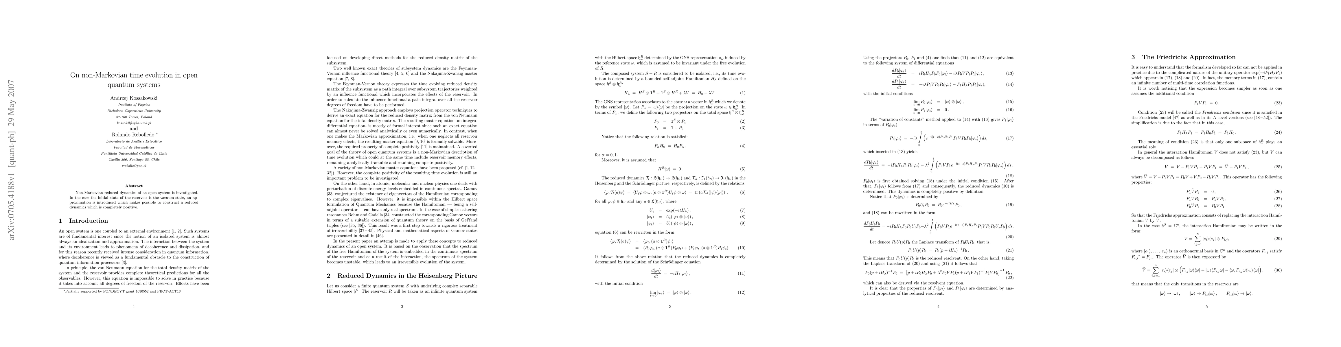 Researchers investigate non-Markovian time evolution in open quantum systems, finding an approximation that allows for a completely positive reduced dynamics when the reservoir's initial state is the vacuum.