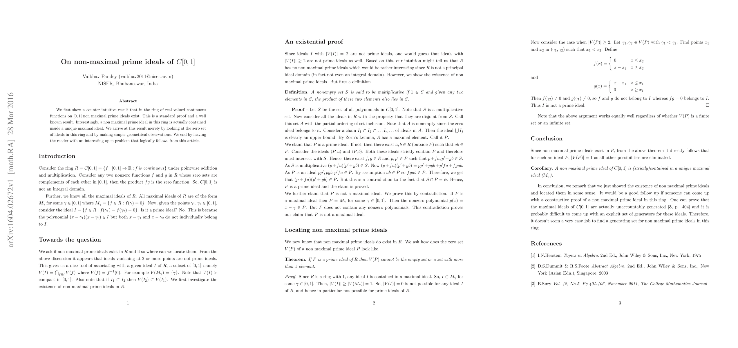 We first show a counter intuitive result that in the ring of real valued continuous functions on $[0,1]$ non maximal prime ideals exist. This is a standard proof and a well known result. Interestingly, a non maximal prime ideal in this ring is actually contained inside a unique maximal ideal. We arrive at this result merely by looking at the zero set of ideals in this ring and by making simple geometrical observations. We end by leaving the reader with an interesting open problem that logically follows from this article.