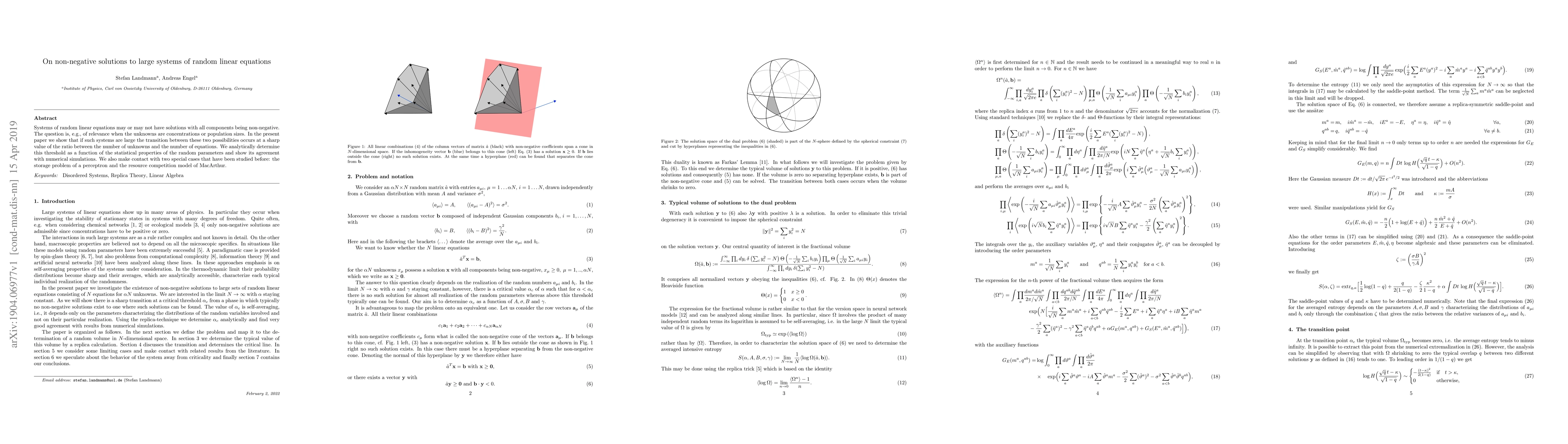 This paper investigates the existence of non-negative solutions in large systems of random linear equations, determining a sharp threshold for such solutions based on the ratio of unknowns to equations. The analytical threshold is shown to align with numerical simulations and connects to prior studies on the perceptron storage problem and the MacArthur resource competition model.