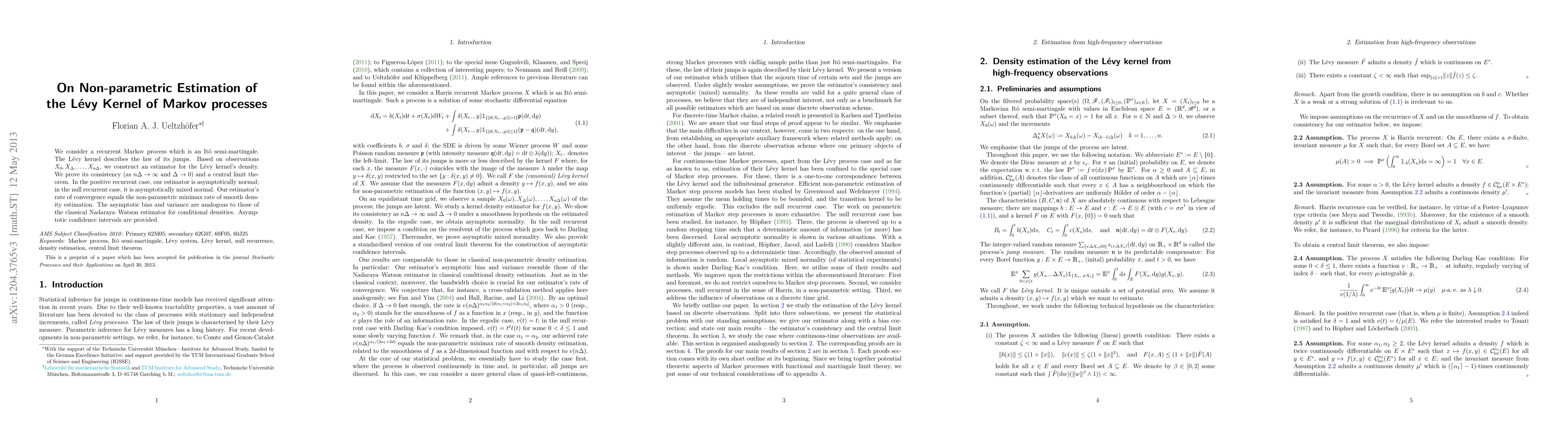 This paper develops a non-parametric estimator for the Lévy kernel density of recurrent Markov processes modeled as Itô semi-martingales. The estimator is shown to be consistent and asymptotically normal in positive recurrence, or mixed normal in null recurrence, achieving the minimax rate of convergence.
