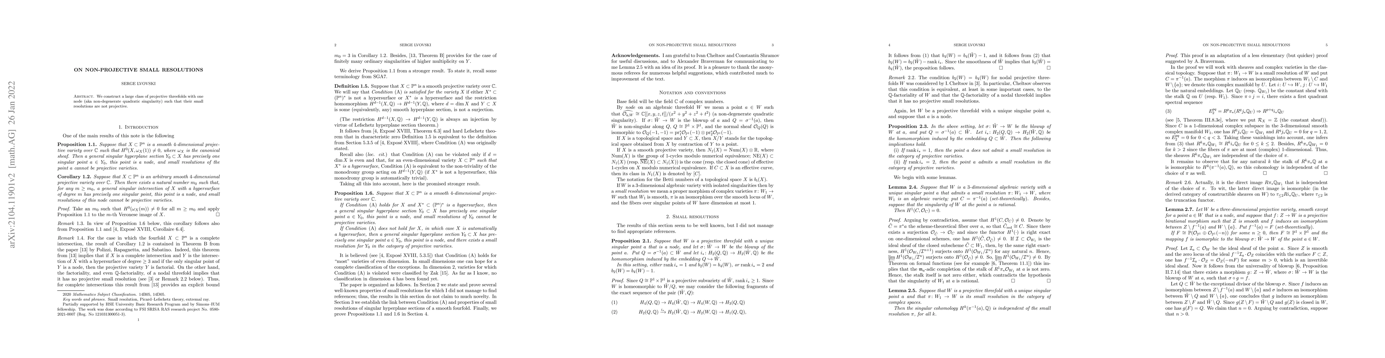 This paper constructs projective threefolds with a single node that have small resolutions which are not projective, expanding the understanding of singularities in algebraic geometry. These findings reveal complexities in the relationship between singularities and their resolutions.