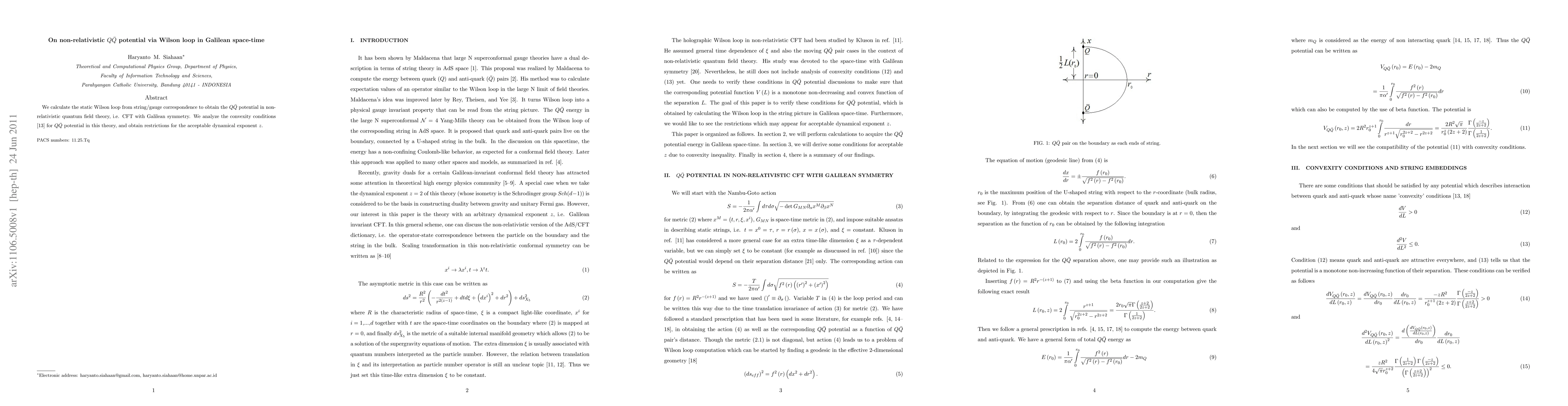 We calculate the static Wilson loop from string/gauge correspondence to obtain the $Q\bar Q$ potential in non-relativistic quantum field theory, i.e. CFT with Galilean symmetry. We analyze the convexity conditions \cite{bachas} for $Q\bar Q$ potential in this theory, and obtain restrictions for the acceptable dynamical exponent $z$.