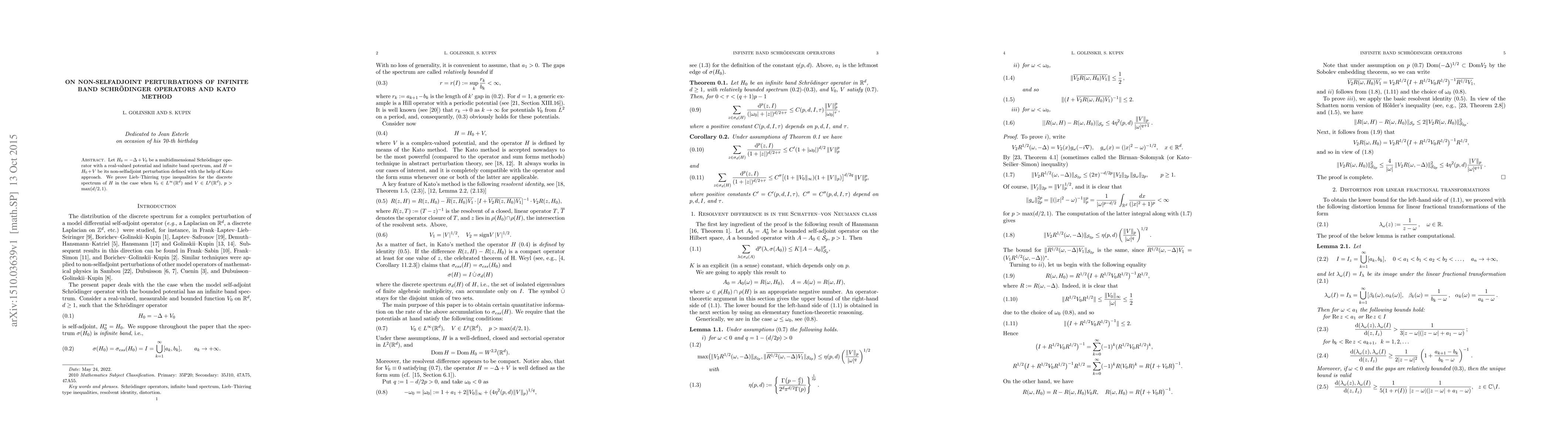 Let $ H_0=-\dd+V_0 $ be a multidimensional Schr\"odinger ope\-rator with a real-valued potential and infinite band spectrum, and $H=H_0+V$ be its non-selfadjoint perturbation defined with the help of Kato approach. We prove Lieb--Thirring type inequalities for the discrete spectrum of $H$ in the case when $V_0\in L^\infty(\br^d)$ and $V\in L^p(\br^d)$, $p>\max(d/2, 1)$.