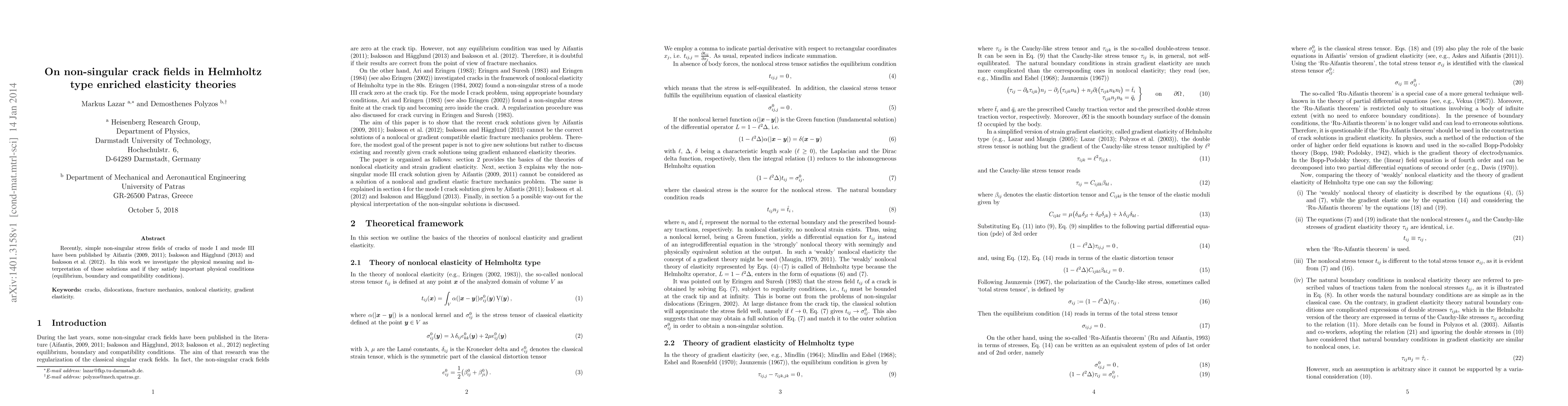 Researchers investigate simple non-singular stress fields of cracks in elasticity theories, focusing on physical conditions such as equilibrium, boundary, and compatibility conditions.