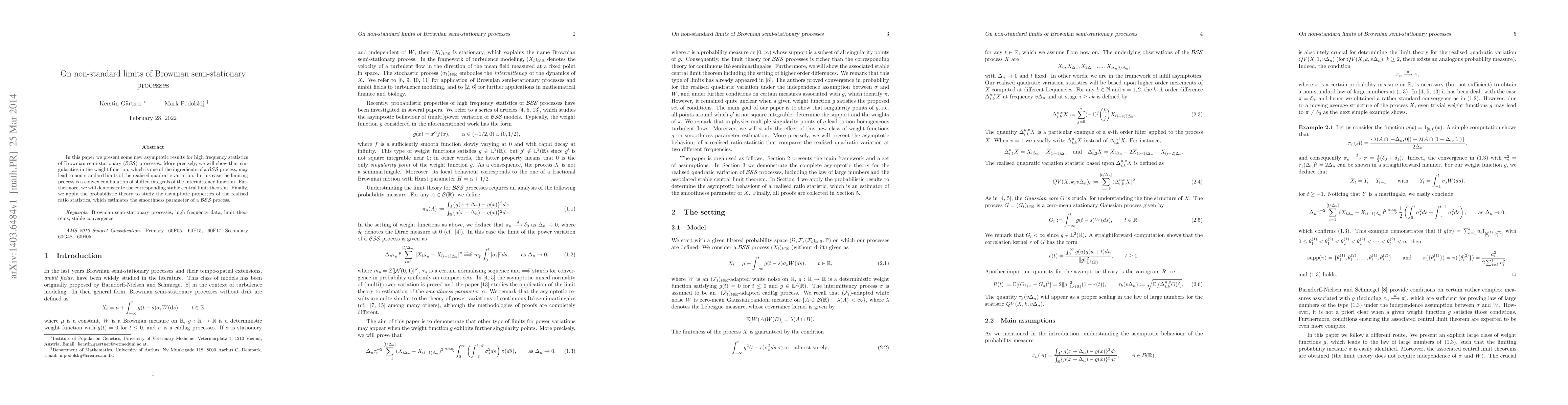 In this paper we present some new asymptotic results for high frequency statistics of Brownian semi-stationary processes. More precisely, we will show that singularities in the weight function, which is one of the ingredients of a BSS process, may lead to non-standard limits of the realised quadratic variation. In this case the limiting process is a convex combination of shifted integrals of the intermittency function. Furthermore, we will demonstrate the corresponding stable central limit theorem. Finally, we apply the probabilistic theory to study the asymptotic properties of the realised ratio statistics, which estimates the smoothness parameter of a BSS process.