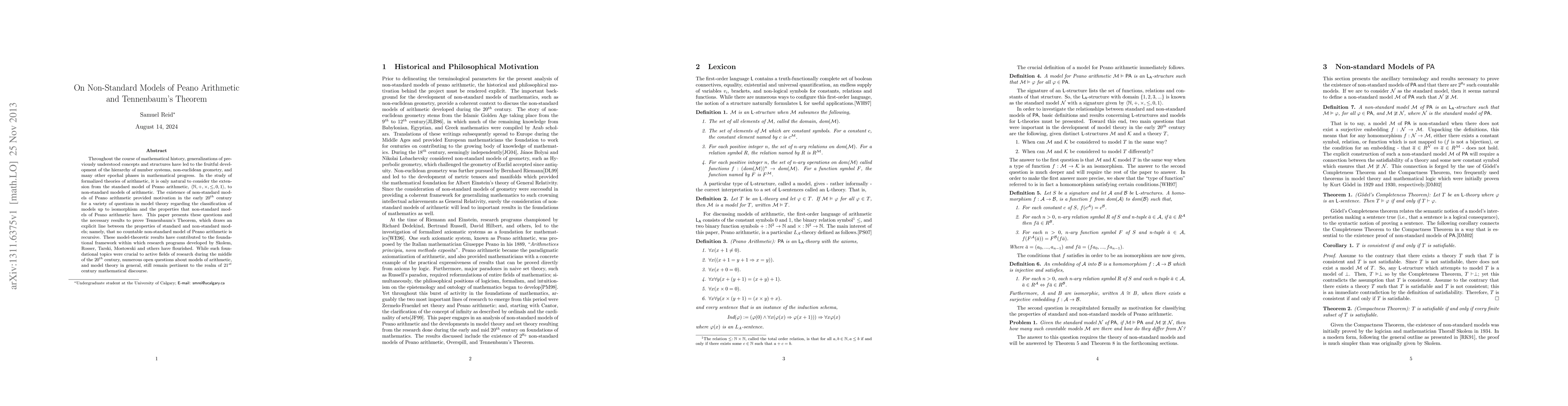 This paper investigates the existence and properties of non-standard models of Peano arithmetic, addressing foundational questions in model theory. It also proves Tennenbaum's Theorem, asserting that no countable non-standard model of Peano arithmetic is recursive, highlighting the distinction between standard and non-standard models.