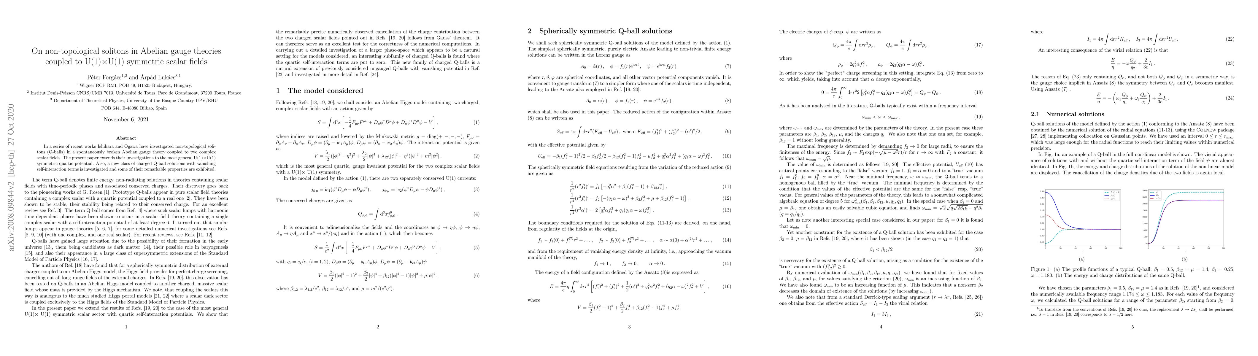 In a series of recent works Ishihara and Ogawa have investigated non-topological solitons (Q-balls) in a spontaneously broken Abelian gauge theory coupled to two complex scalar fields. The present paper extends their investigations to the most general U(1)$\times$U(1) symmetric quartic potential. Also a new class of charged Q-ball solutions with vanishing self-interaction terms is investigated and some of their remarkable properties is exhibited.