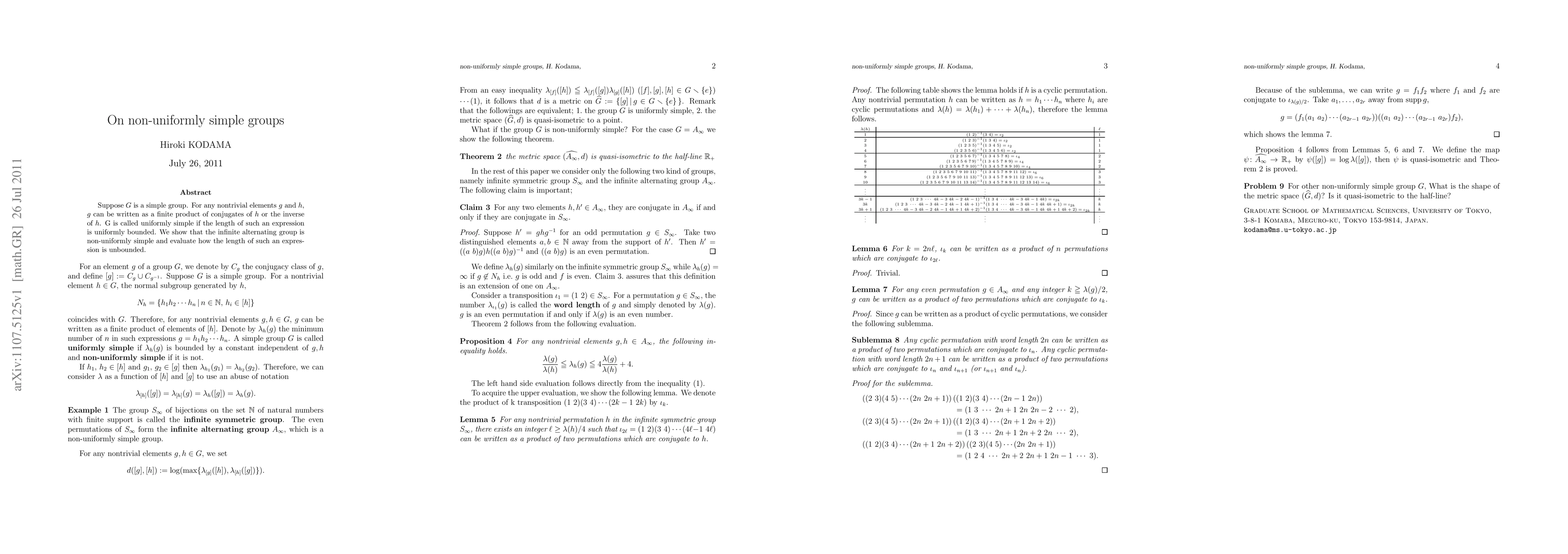 The paper proves that the infinite alternating group is non-uniformly simple, meaning it cannot be expressed as a uniformly bounded product of conjugates or inverses of any single element.