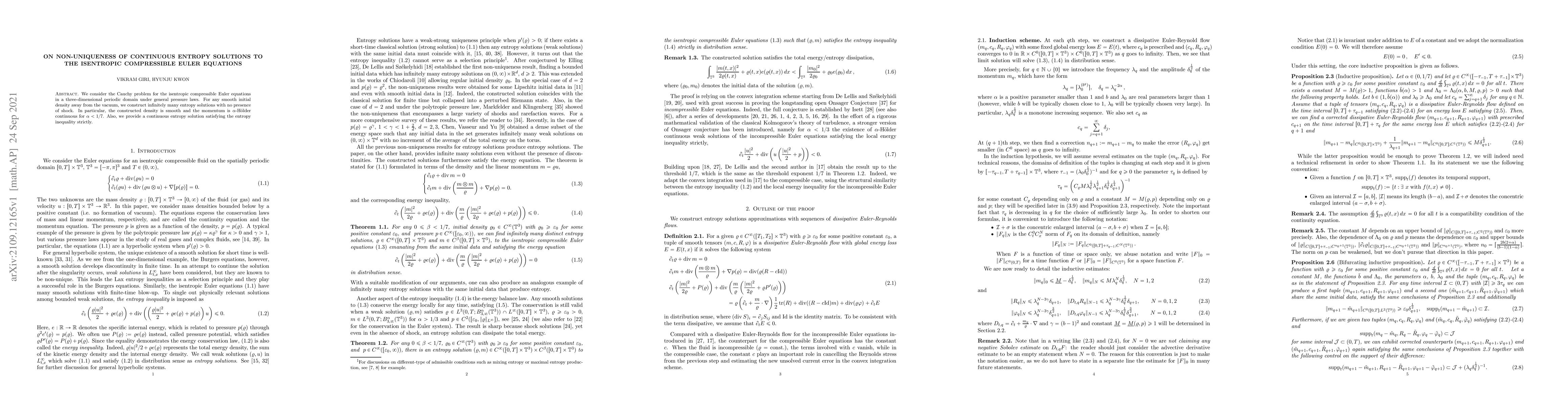 Summary: The paper demonstrates the non-uniqueness of continuous entropy solutions for the isentropic compressible Euler equations in a three-dimensional periodic domain, constructing infinitely many smooth solutions without shocks, and presenting a solution that strictly satisfies the entropy inequality.