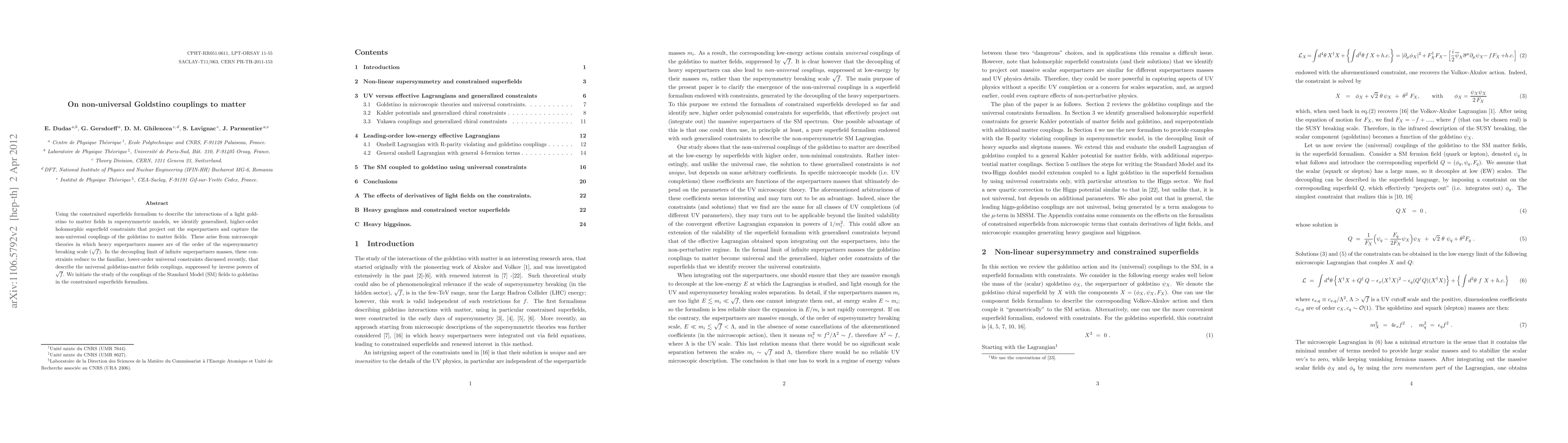 This paper explores non-universal goldstino couplings to matter fields using constrained superfields, identifying higher-order holomorphic constraints that project out superpartners and capture these unique interactions. It contrasts these with universal couplings in the decoupling limit, initiating a study of Standard Model fields' interactions with goldstino.