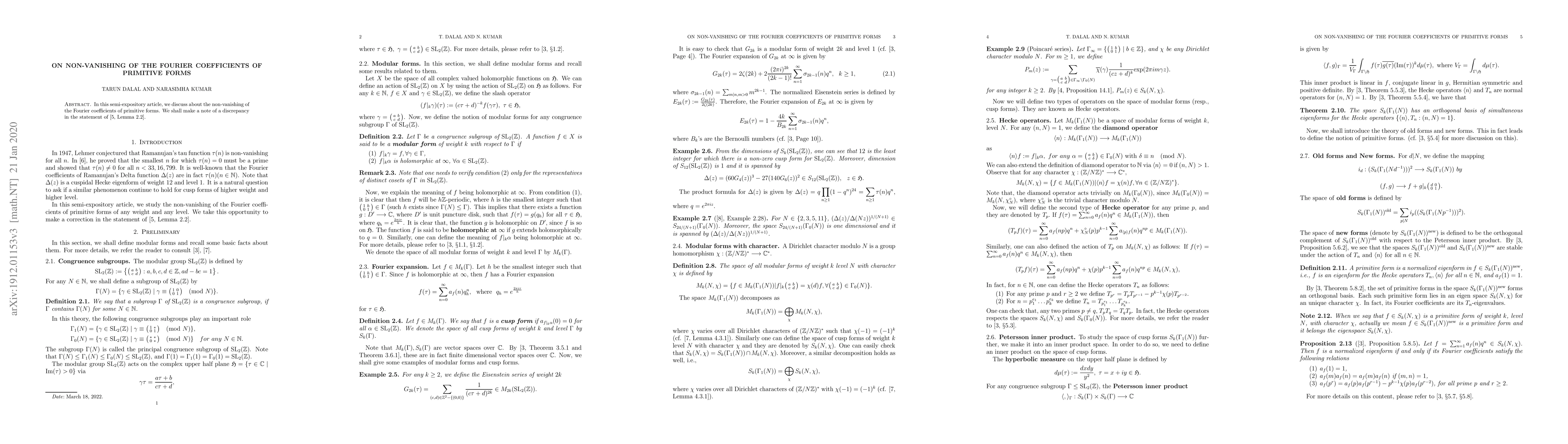 This paper discusses the non-vanishing of Fourier coefficients for primitive forms in mathematics, highlighting a discrepancy in an earlier statement, with implications for the field of mathematical physics.