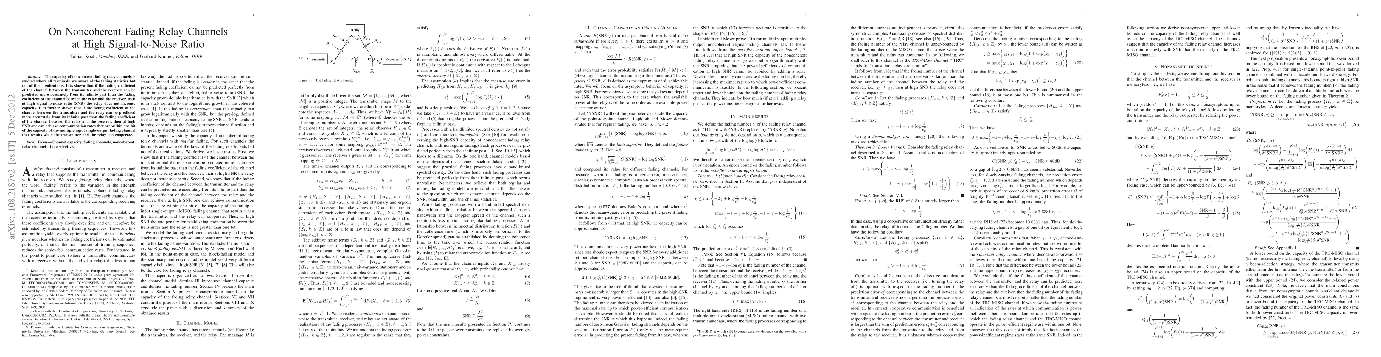 This paper investigates the capacity of noncoherent fading relay channels under high signal-to-noise ratio (SNR) conditions. It concludes that if the transmitter-receiver channel's fading can be predicted more accurately than the relay-receiver channel, the relay does not enhance capacity. Conversely, if the transmitter-relay channel's fading is more predictable, communication rates can approach the capacity of a cooperative transmitter-relay system.