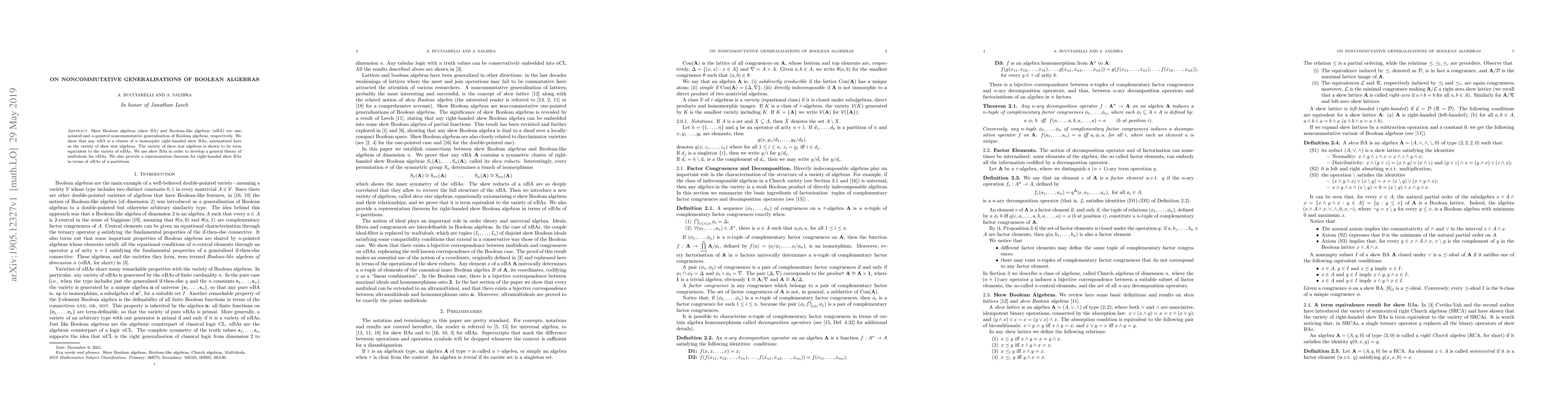 This paper explores noncommutative generalizations of Boolean algebras, introducing skew Boolean algebras and Boolean-like algebras. It demonstrates that Boolean-like algebras are clusters of isomorphic right-handed skew Boolean algebras, axiomatized as skew star algebras, and proves their equivalence. The study also develops a theory of multideals for these algebras and provides a representation theorem linking right-handed skew Boolean algebras to n-partitions.