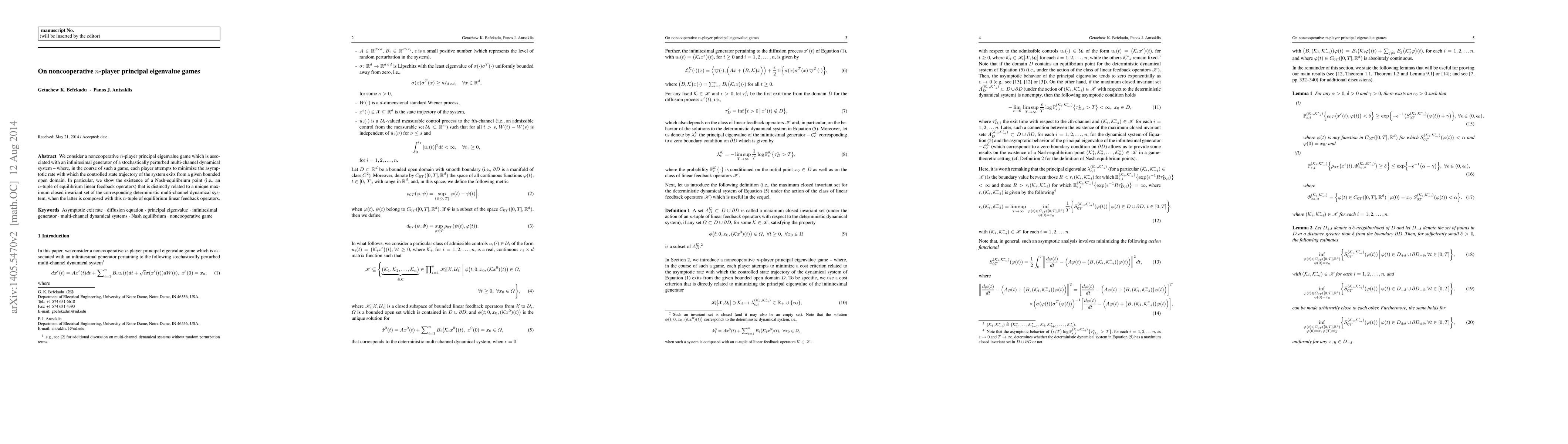 We consider a noncooperative $n$-player principal eigenvalue game which is associated with an infinitesimal generator of a stochastically perturbed multi-channel dynamical system -- where, in the course of such a game, each player attempts to minimize the asymptotic rate with which the controlled state trajectory of the system exits from a given bounded open domain. In particular, we show the existence of a Nash-equilibrium point (i.e., an $n$-tuple of equilibrium linear feedback operators) that is distinctly related to a unique maximum closed invariant set of the corresponding deterministic multi-channel dynamical system, when the latter is composed with this $n$-tuple of equilibrium linear feedback operators.