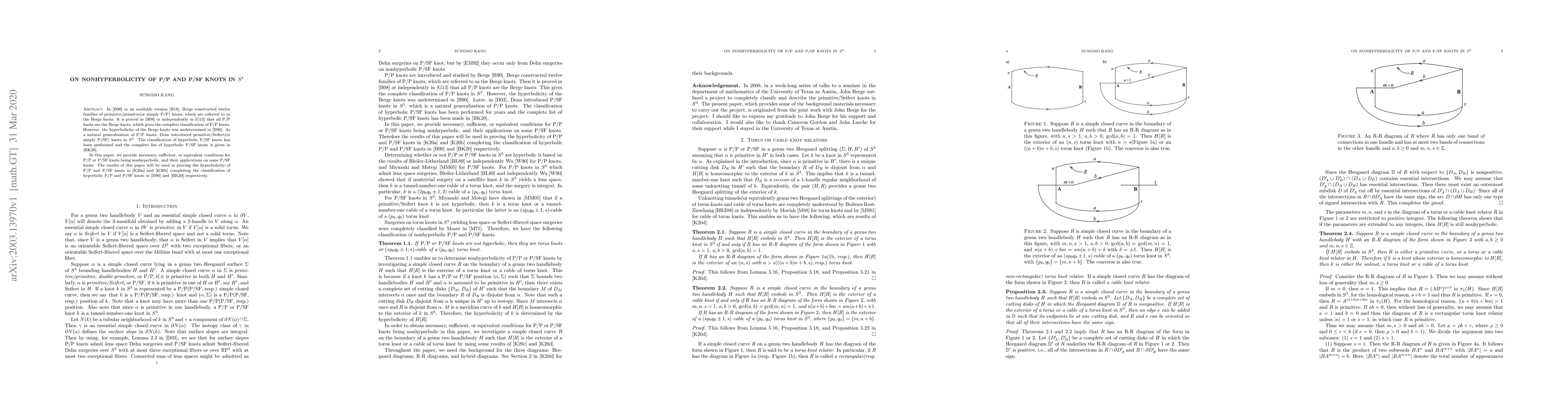 This paper presents criteria for determining the nonhyperbolicity of P/P and P/SF knots in $S^3$, extending the classification work of Berge and Dean. It completes the classification of hyperbolic P/P and P/SF knots, providing foundational results for subsequent studies.