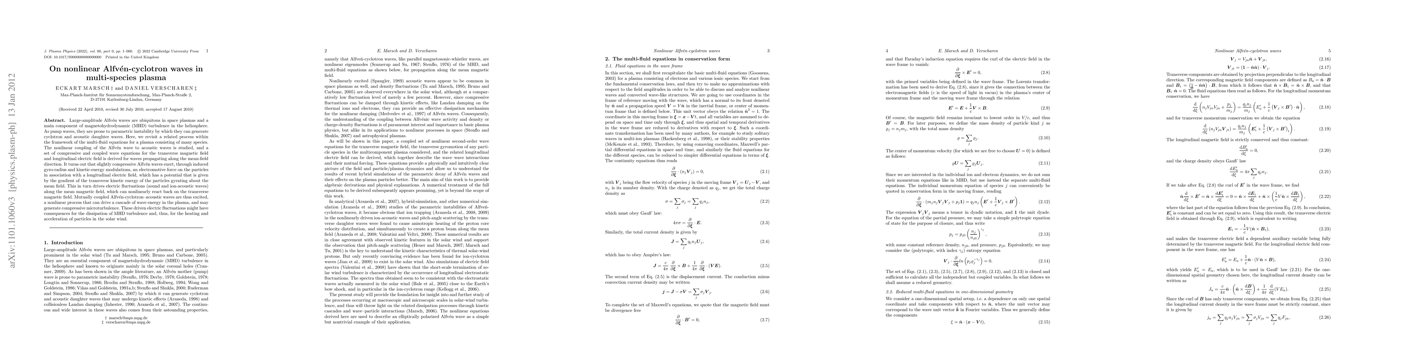 This paper investigates the nonlinear coupling of large-amplitude Alfvén waves to acoustic waves in multi-species plasmas, deriving coupled wave equations for transverse magnetic and longitudinal electric fields. It finds that Alfvén waves induce gyro-radius and kinetic-energy modulations, driving electric fluctuations that may contribute to the dissipation of magnetohydrodynamic turbulence and particle heating in the solar wind.