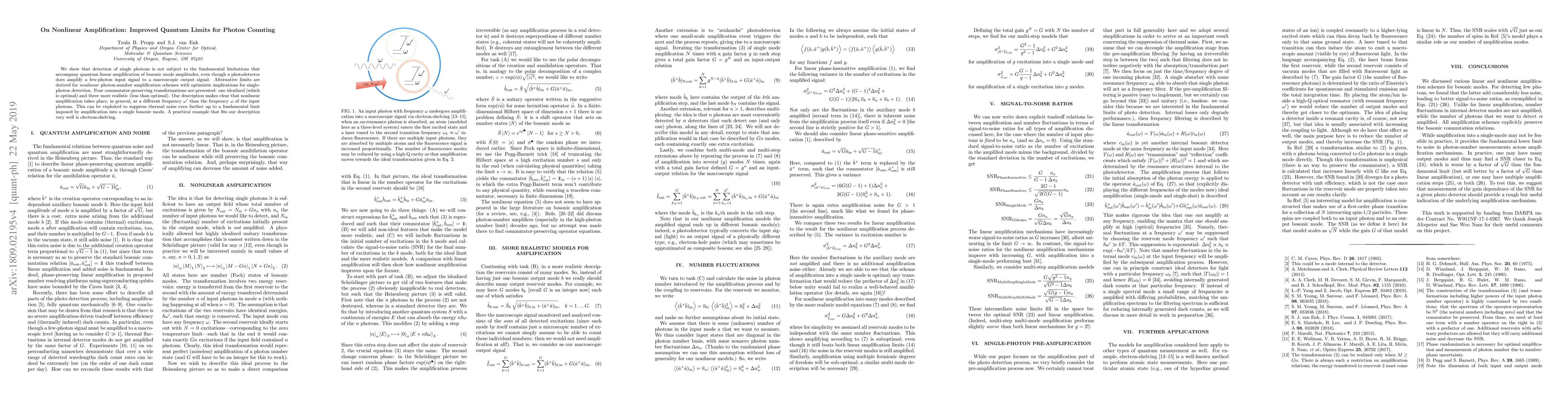 We show that detection of single photons is not subject to the fundamental limitations that accompany quantum linear amplification of bosonic mode amplitudes, even though a photodetector does amplify a few-photon input signal to a macroscopic output signal. Alternative limits are derived for \emph{nonlinear} photon-number amplification schemes with optimistic implications for single-photon detection. Four commutator-preserving transformations are presented: one idealized (which is optimal) and three more realistic (less than optimal). Our description makes clear that nonlinear amplification takes place, in general, at a different frequency $\omega'$ than the frequency $\omega$ of the input photons. This can be exploited to suppress thermal noise even further up to a fundamental limit imposed by amplification into a single bosonic mode. A practical example that fits our description very well is electron-shelving.