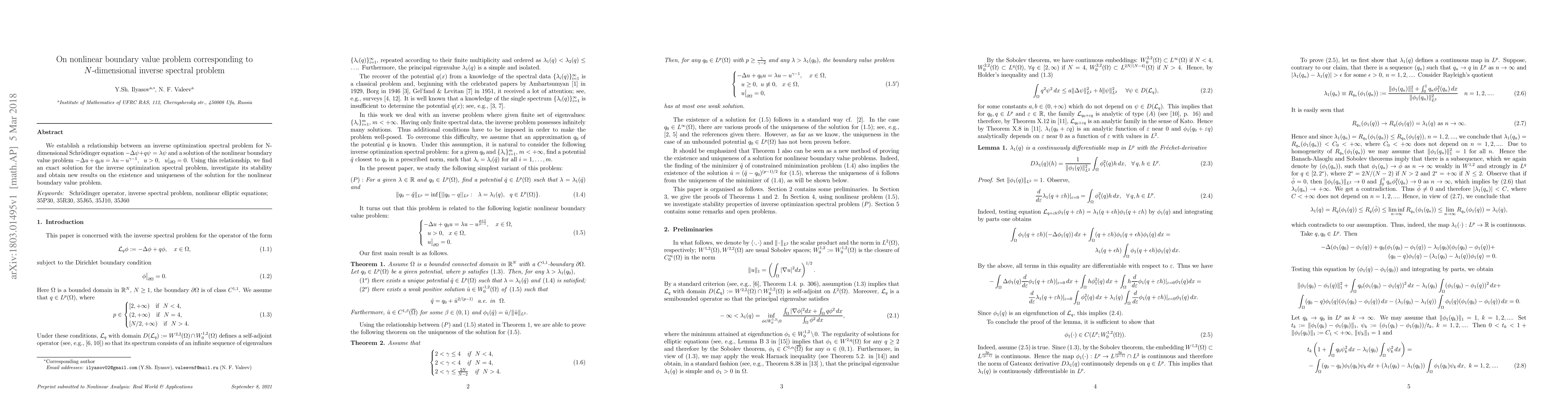 This paper establishes a connection between an inverse spectral problem for the N-dimensional Schrödinger equation and a nonlinear boundary value problem, deriving an exact solution for the former and exploring its stability, while also providing new insights on the existence and uniqueness of solutions for the latter.
