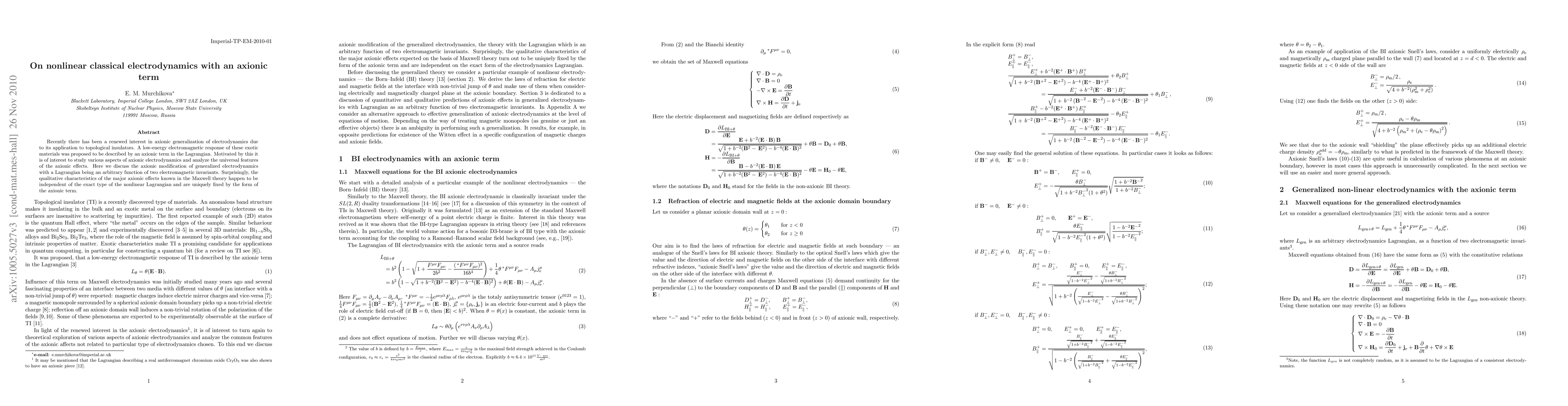 This paper explores the axionic generalization of nonlinear classical electrodynamics, focusing on how an axionic term in the Lagrangian influences the electromagnetic response of topological insulators. It finds that the qualitative characteristics of major axionic effects remain consistent regardless of the specific nonlinear Lagrangian used.