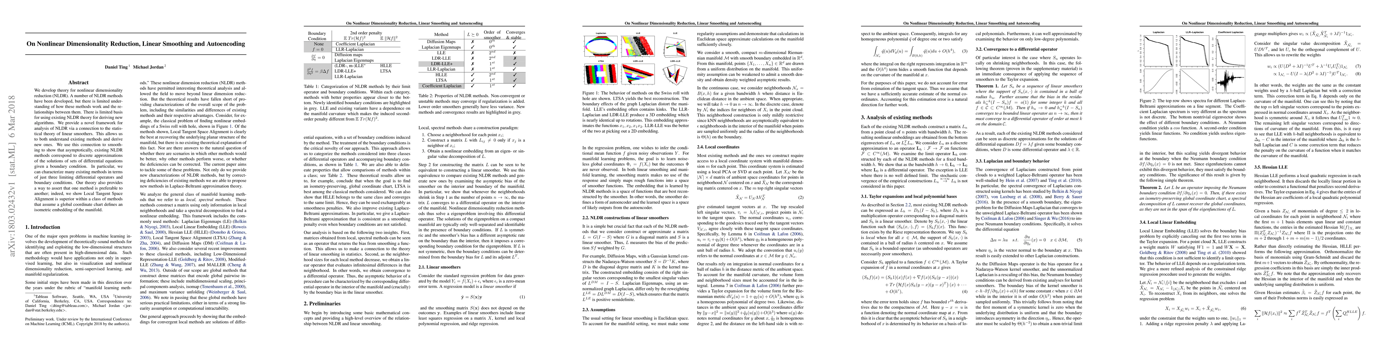 We develop theory for nonlinear dimensionality reduction (NLDR). A number of NLDR methods have been developed, but there is limited understanding of how these methods work and the relationships between them. There is limited basis for using existing NLDR theory for deriving new algorithms. We provide a novel framework for analysis of NLDR via a connection to the statistical theory of linear smoothers. This allows us to both understand existing methods and derive new ones. We use this connection to smoothing to show that asymptotically, existing NLDR methods correspond to discrete approximations of the solutions of sets of differential equations given a boundary condition. In particular, we can characterize many existing methods in terms of just three limiting differential operators and boundary conditions. Our theory also provides a way to assert that one method is preferable to another; indeed, we show Local Tangent Space Alignment is superior within a class of methods that assume a global coordinate chart defines an isometric embedding of the manifold.