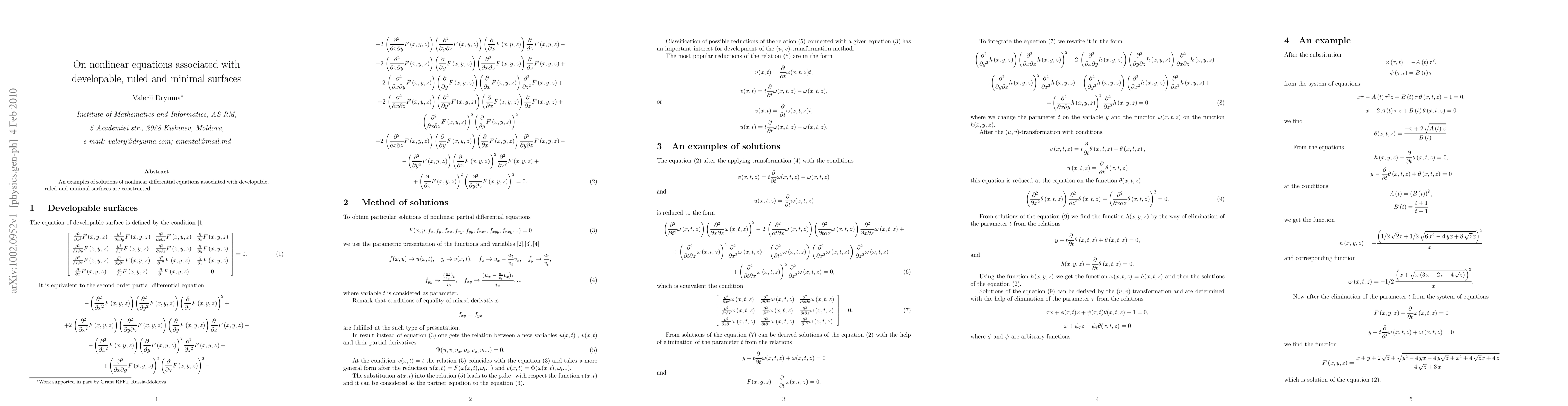 Summary: The paper constructs solutions for nonlinear differential equations linked to developable, ruled, and minimal surfaces, providing concrete examples of these mathematical constructs.