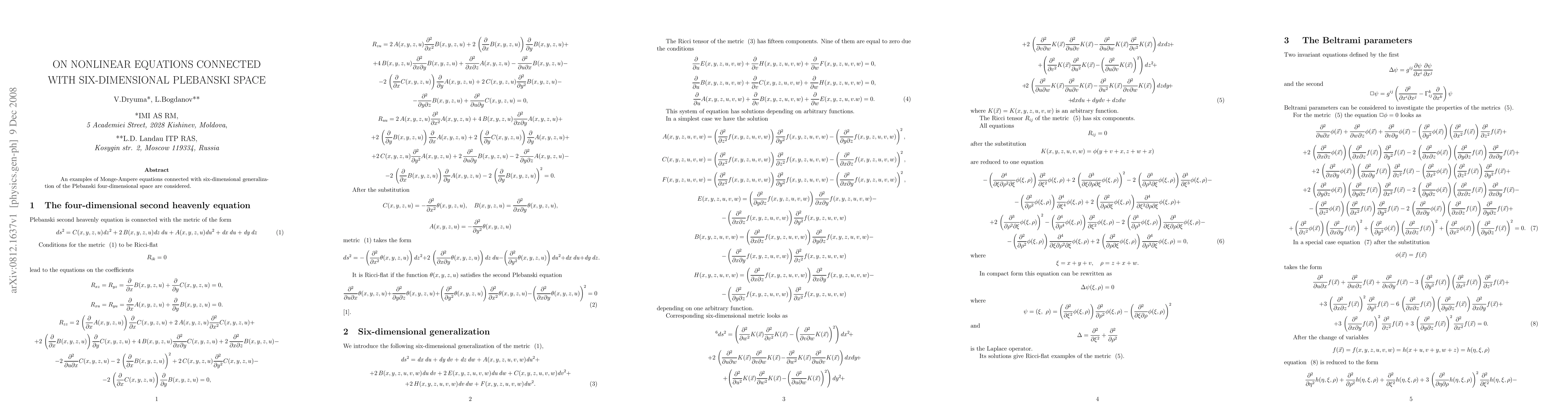 An examples of Monge-Ampere equations connected with six-dimensional generalization of the Plebanski four-dimensional space are considered. Their particular solutions are constructed.