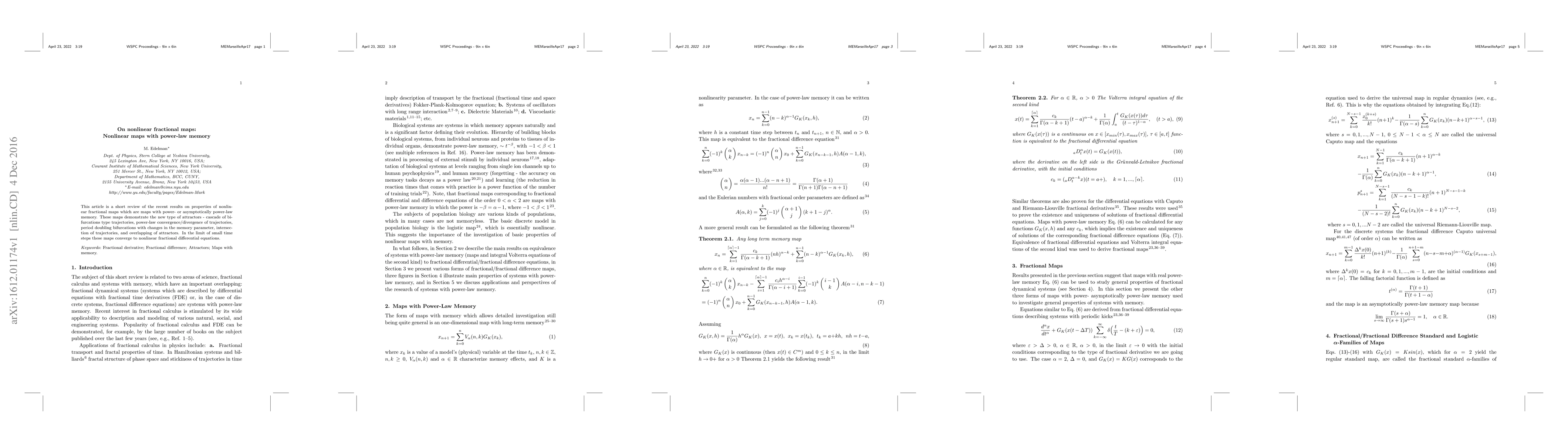 This paper reviews nonlinear fractional maps characterized by power-law memory, showcasing unique attractors, bifurcations, and convergence/divergence patterns, with small time steps leading to nonlinear fractional differential equations.