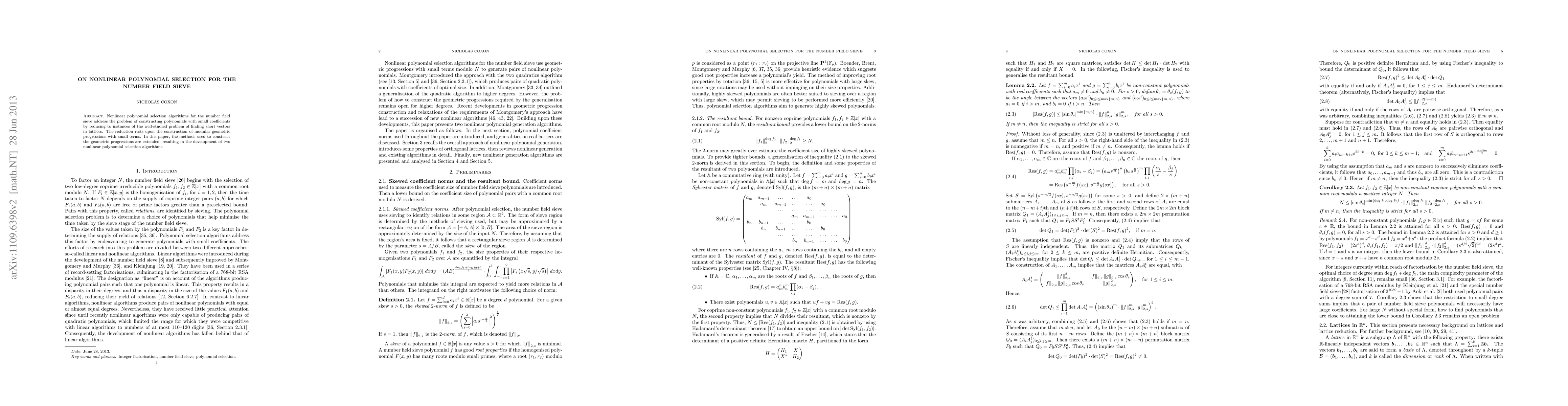 This paper develops two advanced nonlinear polynomial selection algorithms for the number field sieve, enhancing the method by constructing modular geometric progressions with smaller terms, which are crucial for finding polynomials with minimal coefficients. These improvements are achieved through extended methods for constructing these geometric progressions.