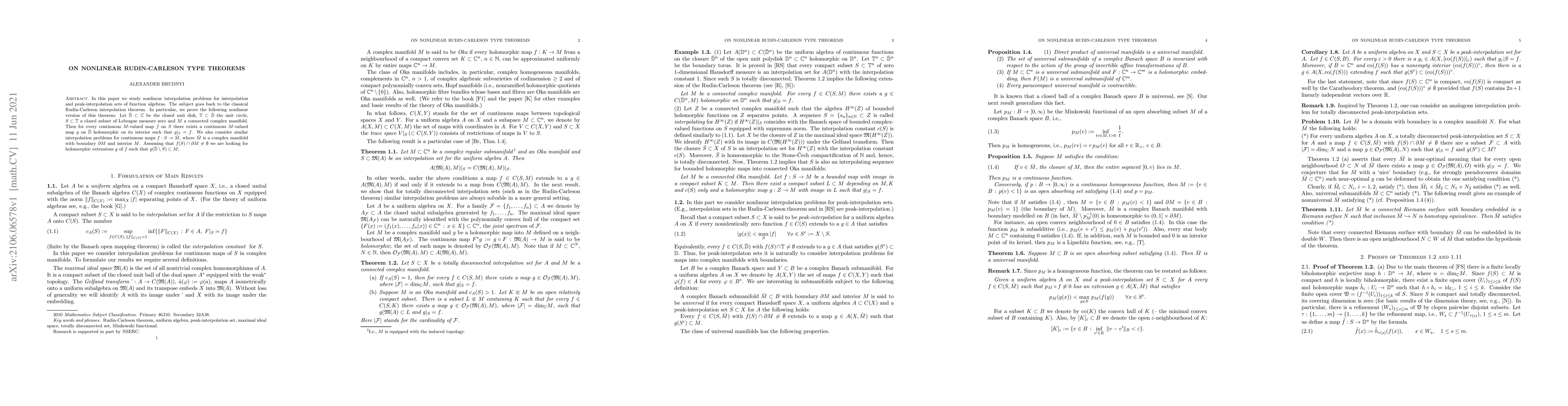 In this paper we study nonlinear interpolation problems for interpolation and peak-interpolation sets of function algebras. The subject goes back to the classical Rudin-Carleson interpolation theorem. In particular, we prove the following nonlinear version of this theorem: Let $\bar{\mathbb D}\subset \mathbb C$ be the closed unit disk, $\mathbb T\subset\bar{\mathbb D}$ the unit circle, $S\subset\mathbb T$ a closed subset of Lebesgue measure zero and $M$ a connected complex manifold. Then for every continuous $M$-valued map $f$ on $S$ there exists a continuous $M$-valued map $g$ on $\bar{\mathbb D}$ holomorphic on its interior such that $g|_S=f$. We also consider similar interpolation problems for continuous maps $f: S\rightarrow\bar M$, where $\bar M$ is a complex manifold with boundary $\partial M$ and interior $M$. Assuming that $f(S)\cap\partial M\ne\emptyset$ we are looking for holomorphic extensions $g$ of $f$ such that $g(\bar{\mathbb D}\setminus S)\subset M$.